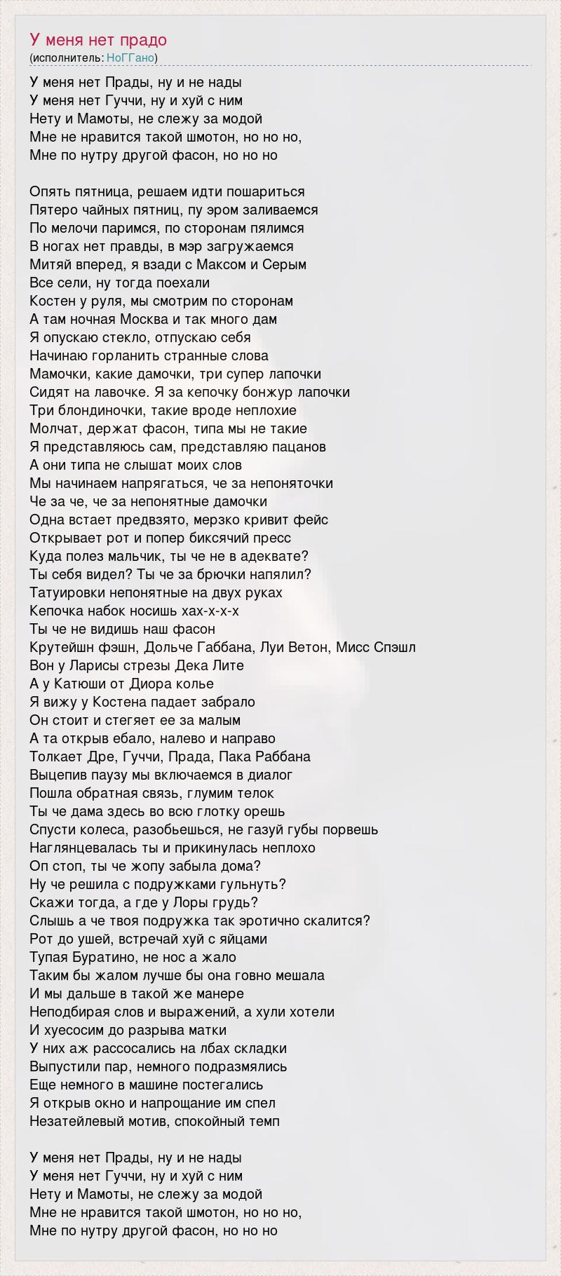 У меня нет Прады, ну и не нады У меня нет Гуччи, ну и хуй с ним Нету и Мамоты, не слежу за модой Мне не нравится такой шмотон, но но но, Мне по нутру другой фасон, но но но Опять пятница, решаем идти пошариться Пятеро чайных пятниц, пу эром заливаемся По мелочи паримся, по сторонам пялимся В ногах нет правды, в мэр загружаемся Митяй вперед, я взади с Максом и Серым Все сели, ну тогда поехали Костен у руля, мы смотрим по сторонам А там ночная Москва и так много дам Я опускаю стекло, отпускаю себя Начинаю горланить странные слова Мамочки, какие дамочки, три супер лапочки Сидят на лавочке. Я за кепочку бонжур лапочки Три блондиночки, такие вроде неплохие Молчат, держат фасон, типа мы не такие Я представляюсь сам, представляю пацанов А они типа не слышат моих слов Мы начинаем напрягаться, че за непоняточки Че за че, че за непонятные дамочки Одна встает предвзято, мерзко кривит фейс Открывает рот и попер биксячий пресс Куда полез мальчик, ты че не в адеквате? Ты себя видел? Ты че за брючки напялил? Татуировки непонятные на двух руках Кепочка набок носишь хах-х-х-х Ты че не видишь наш фасон Крутейшн фэшн, Дольче Габбана, Луи Ветон, Мисс Спэшл Вон у Ларисы стрезы Дека Лите А у Катюши от Диора колье Я вижу у Костена падает забрало Он стоит и стегяет ее за малым А та открыв ебало, налево и направо Толкает Дре, Гуччи, Прада, Пака Раббана Выцепив паузу мы включаемся в диалог Пошла обратная связь, глумим телок Ты че дама здесь во всю глотку орешь Спусти колеса, разобьешься, не газуй губы порвешь Наглянцевалась ты и прикинулась неплохо Оп стоп, ты че жопу забыла дома? Ну че решила с подружками гульнуть? Скажи тогда, а где у Лоры грудь? Слышь а че твоя подружка так эротично скалится? Рот до ушей, встречай хуй с яйцами Тупая Буратино, не нос а жало Таким бы жалом лучше бы она говно мешала И мы дальше в такой же манере Неподбирая слов и выражений, а хули хотели И хуесосим до разрыва матки У них аж рассосались на лбах складки Выпустили пар, немного подразмялись Еще немного в машине постегались Я открыв окно и напрощание им спел Незатейлевый мотив, спокойный темп У меня нет Прады, ну и не нады У меня нет Гуччи, ну и хуй с ним Нету и Мамоты, не слежу за модой Мне не нравится такой шмотон, но но но, Мне по нутру другой фасон, но но но