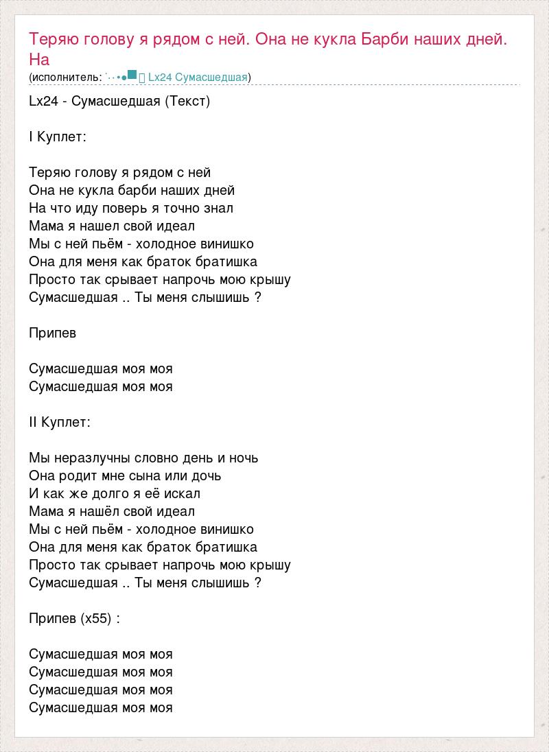 Lx24 - Сумасшедшая (Текст) I Куплет: Теряю голову я рядом с ней Она не кукла барби наших дней На что иду поверь я точно знал Мама я нашел свой идеал Мы с ней пьём - холодное винишко Она для меня как браток братишка Просто так срывает напрочь мою крышу Сумасшедшая .. Ты меня слышишь ? Припев Сумасшедшая моя моя Сумасшедшая моя моя II Куплет: Мы неразлучны словно день и ночь Она родит мне сына или дочь И как же долго я её искал Мама я нашёл свой идеал Мы с ней пьём - холодное винишко Она для меня как браток братишка Просто так срывает напрочь мою крышу Сумасшедшая .. Ты меня слышишь ? Припев (х55) : Сумасшедшая моя моя Сумасшедшая моя моя Сумасшедшая моя моя Сумасшедшая моя моя