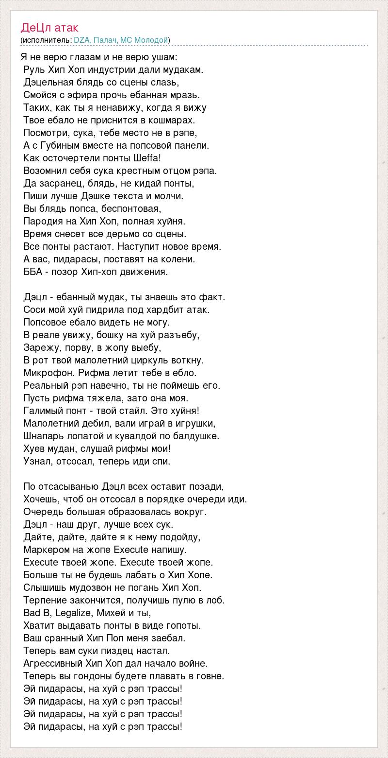 Я не верю глазам и не верю ушам: Руль Хип Хоп индустрии дали мудакам. Дэцельная блядь со сцены слазь, Смойся с эфира прочь ебанная мразь. Таких, как ты я ненавижу, когда я вижу Твое ебало не приснится в кошмарах. Посмотри, сука, тебе место не в рэпе, А с Губиным вместе на попсовой панели. Как осточертели понты Шеffа! Возомнил себя сука крестным отцом рэпа. Да засранец, блядь, не кидай понты, Пиши лучше Дэшке текста и молчи. Вы блядь попса, беспонтовая, Пародия на Хип Хоп, полная хуйня. Время снесет все дерьмо со сцены. Все понты растают. Наступит новое время. А вас, пидарасы, поставят на колени. ББА - позор Хип-хоп движения. Дэцл - ебанный мудак, ты знаешь это факт. Соси мой хуй пидрила под хардбит атак. Попсовое ебало видеть не могу. В реале увижу, бошку на хуй разъебу, Зарежу, порву, в жопу выебу, В рот твой малолетний циркуль воткну. Микрофон. Рифма летит тебе в ебло. Реальный рэп навечно, ты не поймешь его. Пусть рифма тяжела, зато она моя. Галимый понт - твой стайл. Это хуйня! Малолетний дебил, вали играй в игрушки, Шнапарь лопатой и кувалдой по балдушке. Хуев мудан, слушай рифмы мои! Узнал, отсосал, теперь иди спи. По отсасыванью Дэцл всех оставит позади, Хочешь, чтоб он отсосал в порядке очереди иди. Очередь большая образовалась вокруг. Дэцл - наш друг, лучше всех сук. Дайте, дайте, дайте я к нему подойду, Маркером на жопе Execute напишу. Execute твоей жопе. Execute твоей жопе. Больше ты не будешь лабать о Хип Хопе. Слышишь мудозвон не погань Хип Хоп. Терпение закончится, получишь пулю в лоб. Bad B, Legalize, Михей и ты, Хватит выдавать понты в виде гопоты. Ваш сранный Хип Поп меня заебал. Теперь вам суки пиздец настал. Агрессивный Хип Хоп дал начало войне. Теперь вы гондоны будете плавать в говне. Эй пидарасы, на хуй с рэп трассы! Эй пидарасы, на хуй с рэп трассы! Эй пидарасы, на хуй с рэп трассы! Эй пидарасы, на хуй с рэп трассы!