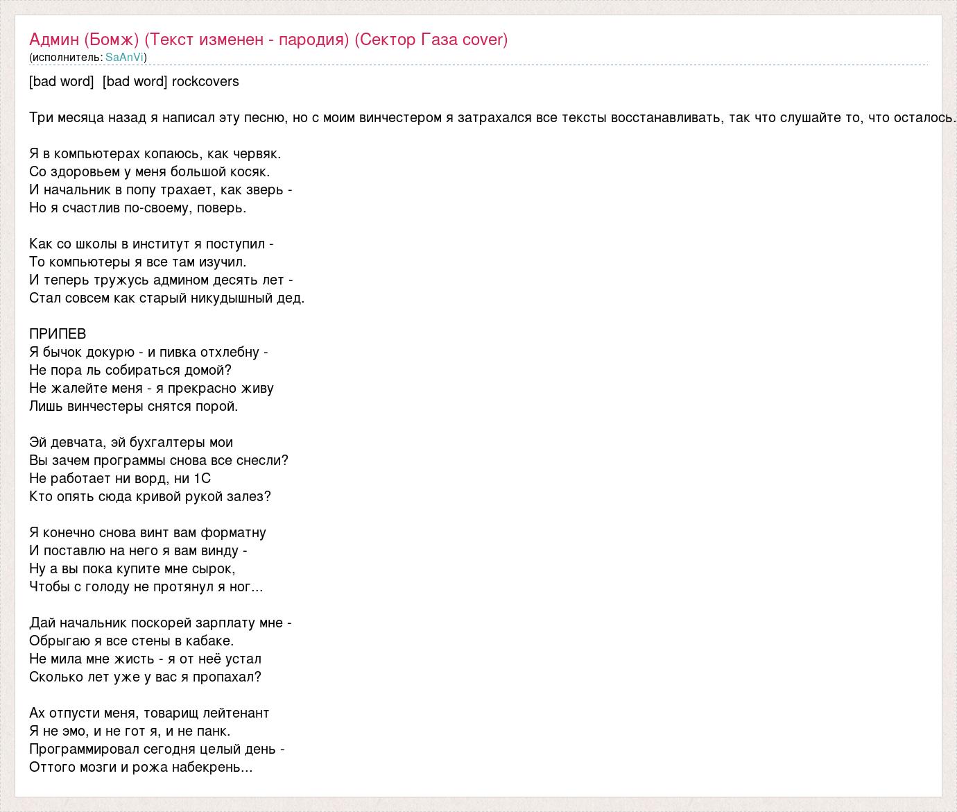 [bad word] [bad word] rockcovers Три месяца назад я написал эту песню, но с моим винчестером я затрахался все тексты восстанавливать, так что слушайте то, что осталось. Я в компьютерах копаюсь, как червяк. Со здоровьем у меня большой косяк. И начальник в попу трахает, как зверь - Но я счастлив по-своему, поверь. Как со школы в институт я поступил - То компьютеры я все там изучил. И теперь тружусь админом десять лет - Стал совсем как старый никудышный дед. ПРИПЕВ Я бычок докурю - и пивка отхлебну - Не пора ль собираться домой? Не жалейте меня - я прекрасно живу Лишь винчестеры снятся порой. Эй девчата, эй бухгалтеры мои Вы зачем программы снова все снесли? Не работает ни ворд, ни 1С Кто опять сюда кривой рукой залез? Я конечно снова винт вам форматну И поставлю на него я вам винду - Ну а вы пока купите мне сырок, Чтобы с голоду не протянул я ног... Дай начальник поскорей зарплату мне - Обрыгаю я все стены в кабаке. Не мила мне жисть - я от неё устал Сколько лет уже у вас я пропахал? Ах отпусти меня, товарищ лейтенант Я не эмо, и не гот я, и не панк. Программировал сегодня целый день - Оттого мозги и рожа набекрень...
