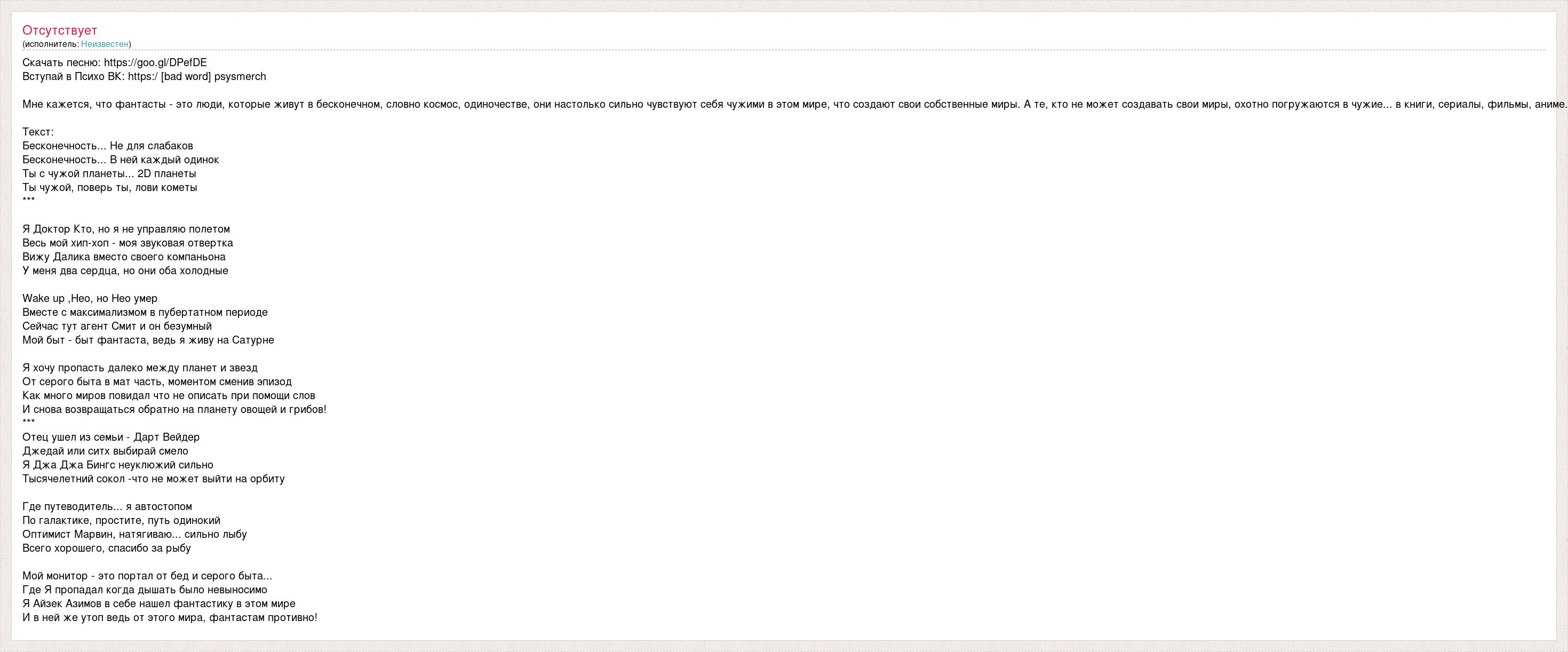 Скачать песню: https://goo.gl/DPefDE Вступай в Психо ВК: https:/ [bad word] psysmerch Мне кажется, что фантасты - это люди, которые живут в бесконечном, словно космос, одиночестве, они настолько сильно чувствуют себя чужими в этом мире, что создают свои собственные миры. А те, кто не может создавать свои миры, охотно погружаются в чужие... в книги, сериалы, фильмы, аниме. Текст: Бесконечность... Не для слабаков Бесконечность... В ней каждый одинок Ты с чужой планеты... 2D планеты Ты чужой, поверь ты, лови кометы *** Я Доктор Кто, но я не управляю полетом Весь мой хип-хоп - моя звуковая отвертка Вижу Далика вместо своего компаньона У меня два сердца, но они оба холодные Wake up ,Нео, но Нео умер Вместе с максимализмом в пубертатном периоде Сейчас тут агент Смит и он безумный Мой быт - быт фантаста, ведь я живу на Сатурне Я хочу пропасть далеко между планет и звезд От серого быта в мат часть, моментом сменив эпизод Как много миров повидал что не описать при помощи слов И снова возвращаться обратно на планету овощей и грибов! *** Отец ушел из семьи - Дарт Вейдер Джедай или ситх выбирай смело Я Джа Джа Бингс неуклюжий сильно Тысячелетний сокол -что не может выйти на орбиту Где путеводитель... я автостопом По галактике, простите, путь одинокий Оптимист Марвин, натягиваю... сильно лыбу Всего хорошего, спасибо за рыбу Мой монитор - это портал от бед и серого быта... Где Я пропадал когда дышать было невыносимо Я Айзек Азимов в себе нашел фантастику в этом мире И в ней же утоп ведь от этого мира, фантастам противно!