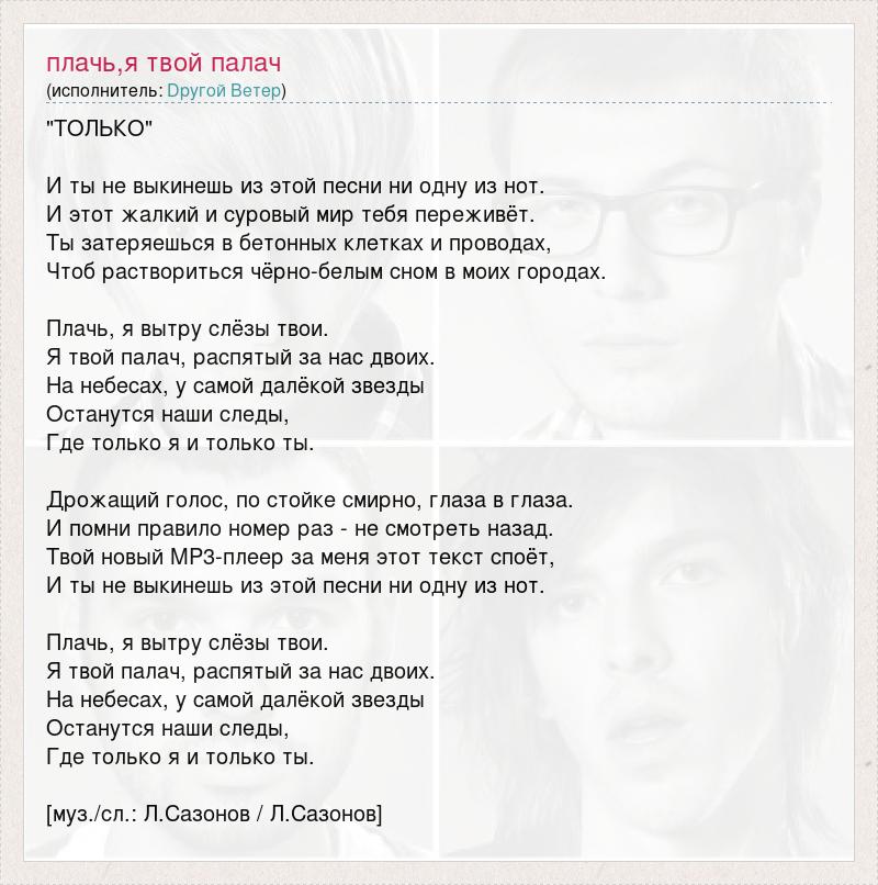 "ТОЛЬКО" И ты не выкинешь из этой песни ни одну из нот. И этот жалкий и суровый мир тебя переживёт. Ты затеряешься в бетонных клетках и проводах, Чтоб раствориться чёрно-белым сном в моих городах. Плачь, я вытру слёзы твои. Я твой палач, распятый за нас двоих. На небесах, у самой далёкой звезды Останутся наши следы, Где только я и только ты. Дрожащий голос, по стойке смирно, глаза в глаза. И помни правило номер раз - не смотреть назад. Твой новый MP3-плеер за меня этот текст споёт, И ты не выкинешь из этой песни ни одну из нот. Плачь, я вытру слёзы твои. Я твой палач, распятый за нас двоих. На небесах, у самой далёкой звезды Останутся наши следы, Где только я и только ты. [муз./сл.: Л.Сазонов / Л.Сазонов]