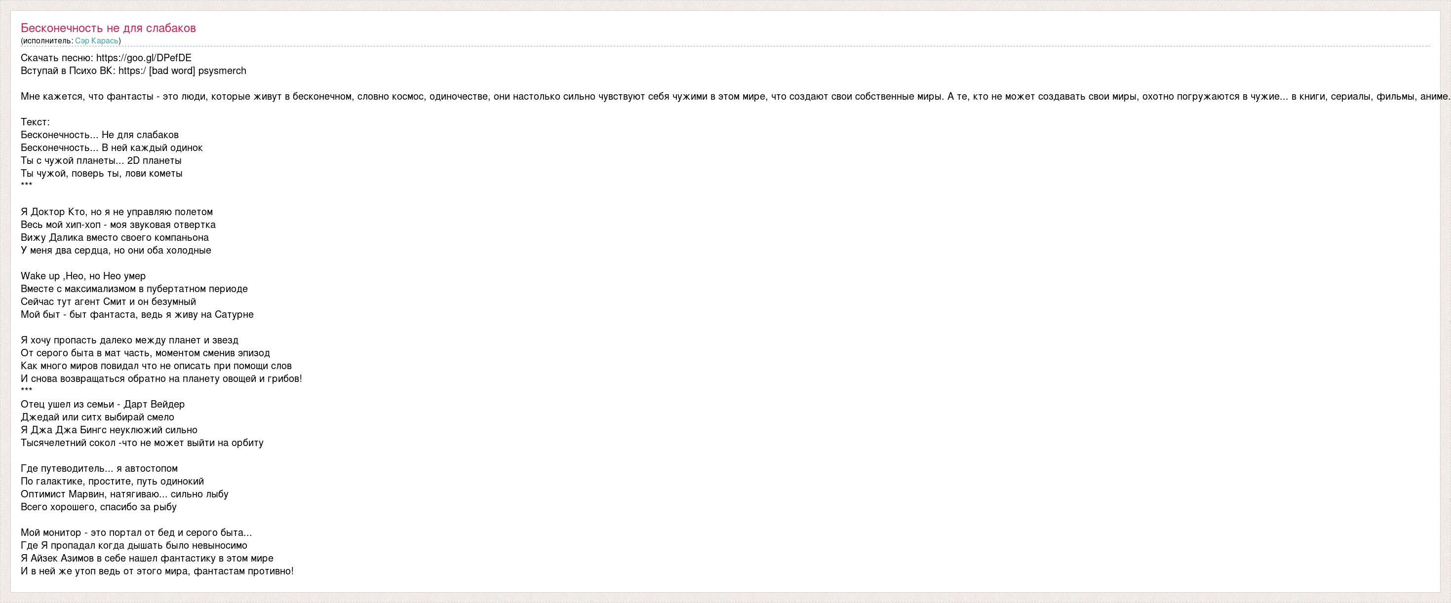 Скачать песню: https://goo.gl/DPefDE Вступай в Психо ВК: https:/ [bad word] psysmerch Мне кажется, что фантасты - это люди, которые живут в бесконечном, словно космос, одиночестве, они настолько сильно чувствуют себя чужими в этом мире, что создают свои собственные миры. А те, кто не может создавать свои миры, охотно погружаются в чужие... в книги, сериалы, фильмы, аниме. Текст: Бесконечность... Не для слабаков Бесконечность... В ней каждый одинок Ты с чужой планеты... 2D планеты Ты чужой, поверь ты, лови кометы *** Я Доктор Кто, но я не управляю полетом Весь мой хип-хоп - моя звуковая отвертка Вижу Далика вместо своего компаньона У меня два сердца, но они оба холодные Wake up ,Нео, но Нео умер Вместе с максимализмом в пубертатном периоде Сейчас тут агент Смит и он безумный Мой быт - быт фантаста, ведь я живу на Сатурне Я хочу пропасть далеко между планет и звезд От серого быта в мат часть, моментом сменив эпизод Как много миров повидал что не описать при помощи слов И снова возвращаться обратно на планету овощей и грибов! *** Отец ушел из семьи - Дарт Вейдер Джедай или ситх выбирай смело Я Джа Джа Бингс неуклюжий сильно Тысячелетний сокол -что не может выйти на орбиту Где путеводитель... я автостопом По галактике, простите, путь одинокий Оптимист Марвин, натягиваю... сильно лыбу Всего хорошего, спасибо за рыбу Мой монитор - это портал от бед и серого быта... Где Я пропадал когда дышать было невыносимо Я Айзек Азимов в себе нашел фантастику в этом мире И в ней же утоп ведь от этого мира, фантастам противно!