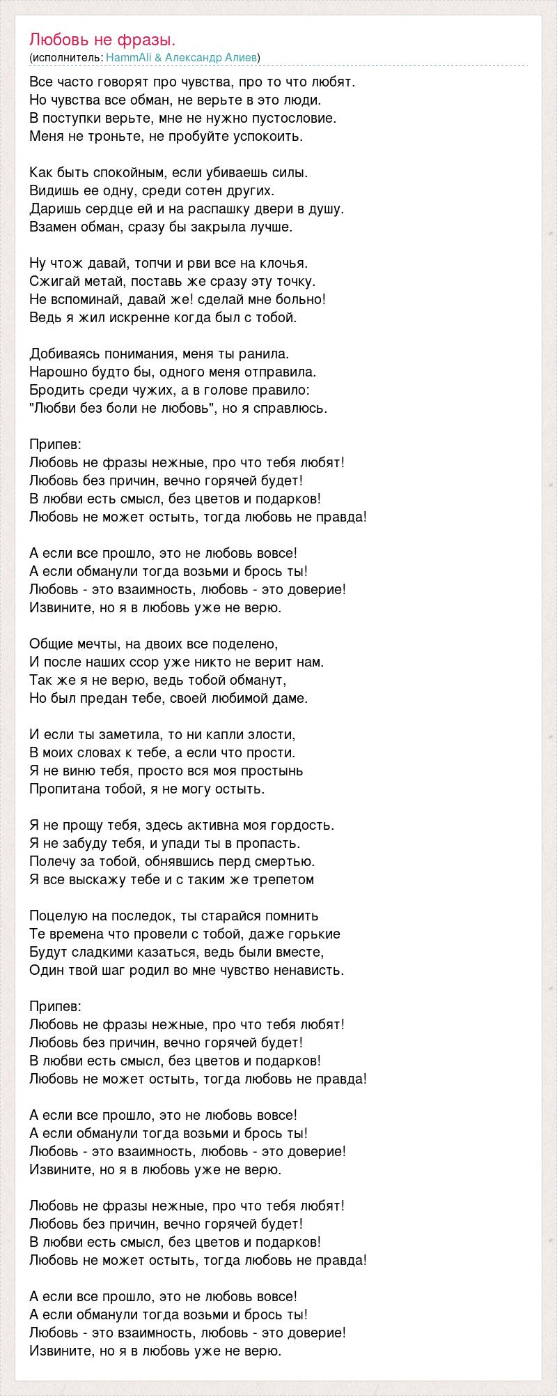 Все часто говорят про чувства, про то что любят. Но чувства все обман, не верьте в это люди. В поступки верьте, мне не нужно пустословие. Меня не троньте, не пробуйте успокоить. Как быть спокойным, если убиваешь силы. Видишь ее одну, среди сотен других. Даришь сердце ей и на распашку двери в душу. Взамен обман, сразу бы закрыла лучше. Ну чтож давай, топчи и рви все на клочья. Сжигай метай, поставь же сразу эту точку. Не вспоминай, давай же! сделай мне больно! Ведь я жил искренне когда был с тобой. Добиваясь понимания, меня ты ранила. Нарошно будто бы, одного меня отправила. Бродить среди чужих, а в голове правило: "Любви без боли не любовь", но я справлюсь. Припев: Любовь не фразы нежные, про что тебя любят! Любовь без причин, вечно горячей будет! В любви есть смысл, без цветов и подарков! Любовь не может остыть, тогда любовь не правда! А если все прошло, это не любовь вовсе! А если обманули тогда возьми и брось ты! Любовь - это взаимность, любовь - это доверие! Извините, но я в любовь уже не верю. Общие мечты, на двоих все поделено, И после наших ссор уже никто не верит нам. Так же я не верю, ведь тобой обманут, Но был предан тебе, своей любимой даме. И если ты заметила, то ни капли злости, В моих словах к тебе, а если что прости. Я не виню тебя, просто вся моя простынь Пропитана тобой, я не могу остыть. Я не прощу тебя, здесь активна моя гордость. Я не забуду тебя, и упади ты в пропасть. Полечу за тобой, обнявшись перд смертью. Я все выскажу тебе и с таким же трепетом Поцелую на последок, ты старайся помнить Те времена что провели с тобой, даже горькие Будут сладкими казаться, ведь были вместе, Один твой шаг родил во мне чувство ненависть. Припев: Любовь не фразы нежные, про что тебя любят! Любовь без причин, вечно горячей будет! В любви есть смысл, без цветов и подарков! Любовь не может остыть, тогда любовь не правда! А если все прошло, это не любовь вовсе! А если обманули тогда возьми и брось ты! Любовь - это взаимность, любовь - это доверие! Извините, но я в любовь уже не верю. Любовь не фразы нежные, про что тебя любят! Любовь без причин, вечно горячей будет! В любви есть смысл, без цветов и подарков! Любовь не может остыть, тогда любовь не правда! А если все прошло, это не любовь вовсе! А если обманули тогда возьми и брось ты! Любовь - это взаимность, любовь - это доверие! Извините, но я в любовь уже не верю.