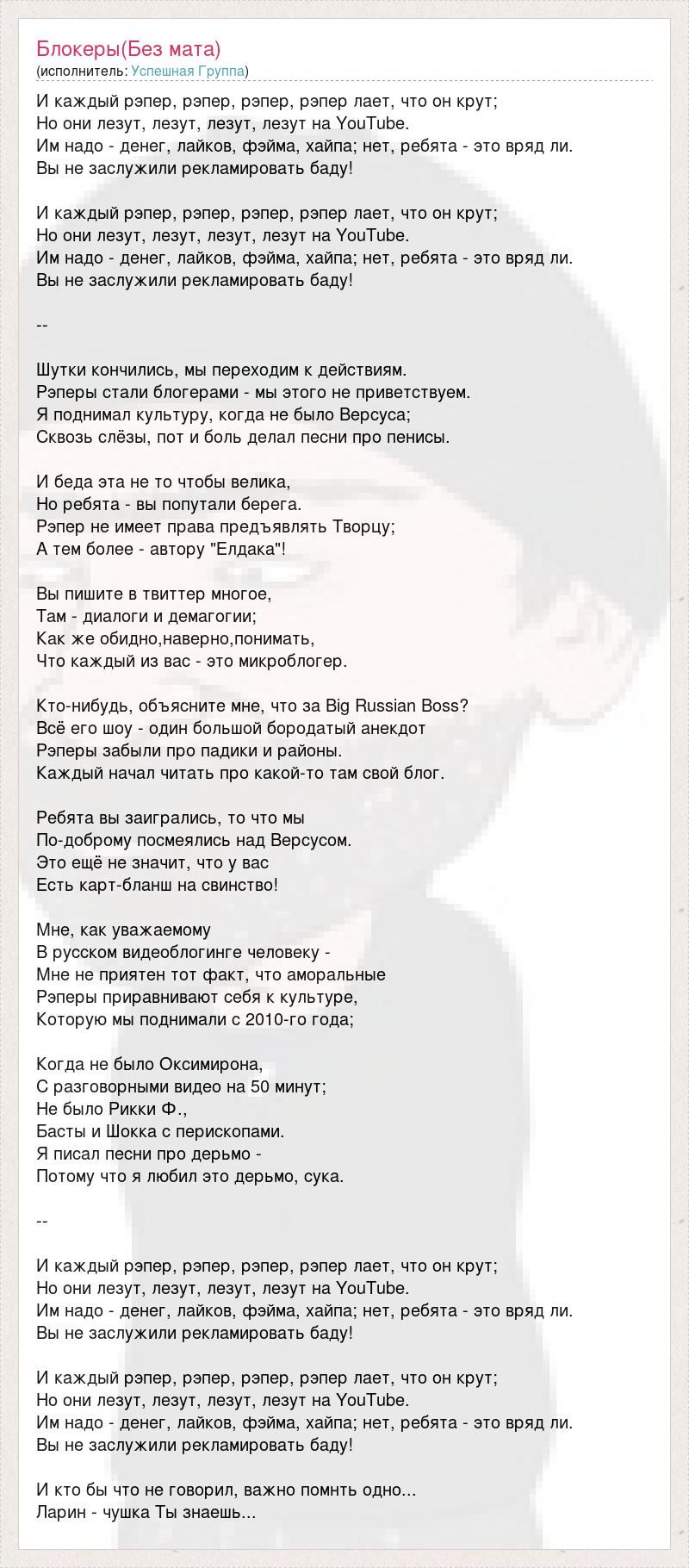 И каждый рэпер, рэпер, рэпер, рэпер лает, что он крут; Но они лезут, лезут, лезут, лезут на YouTube. Им надо - денег, лайков, фэйма, хайпа; нет, ребята - это вряд ли. Вы не заслужили рекламировать баду! И каждый рэпер, рэпер, рэпер, рэпер лает, что он крут; Но они лезут, лезут, лезут, лезут на YouTube. Им надо - денег, лайков, фэйма, хайпа; нет, ребята - это вряд ли. Вы не заслужили рекламировать баду! -- Шутки кончились, мы переходим к действиям. Рэперы стали блогерами - мы этого не приветствуем. Я поднимал культуру, когда не было Версуса; Сквозь слёзы, пот и боль делал песни про пенисы. И беда эта не то чтобы велика, Но ребята - вы попутали берега. Рэпер не имеет права предъявлять Творцу; А тем более - автору "Елдака"! Вы пишите в твиттер многое, Там - диалоги и демагогии; Как же обидно,наверно,понимать, Что каждый из вас - это микроблогер. Кто-нибудь, объясните мне, что за Big Russian Boss? Всё его шоу - один большой бородатый анекдот Рэперы забыли про падики и районы. Каждый начал читать про какой-то там свой блог. Ребята вы заигрались, то что мы По-доброму посмеялись над Версусом. Это ещё не значит, что у вас Есть карт-бланш на свинство! Мне, как уважаемому В русском видеоблогинге человеку - Мне не приятен тот факт, что аморальные Рэперы приравнивают себя к культуре, Которую мы поднимали с 2010-го года; Когда не было Оксимирона, С разговорными видео на 50 минут; Не было Рикки Ф., Басты и Шокка с перископами. Я писал песни про дерьмо - Потому что я любил это дерьмо, сука. -- И каждый рэпер, рэпер, рэпер, рэпер лает, что он крут; Но они лезут, лезут, лезут, лезут на YouTube. Им надо - денег, лайков, фэйма, хайпа; нет, ребята - это вряд ли. Вы не заслужили рекламировать баду! И каждый рэпер, рэпер, рэпер, рэпер лает, что он крут; Но они лезут, лезут, лезут, лезут на YouTube. Им надо - денег, лайков, фэйма, хайпа; нет, ребята - это вряд ли. Вы не заслужили рекламировать баду! И кто бы что не говорил, важно помнть одно... Ларин - чушка Ты знаешь...