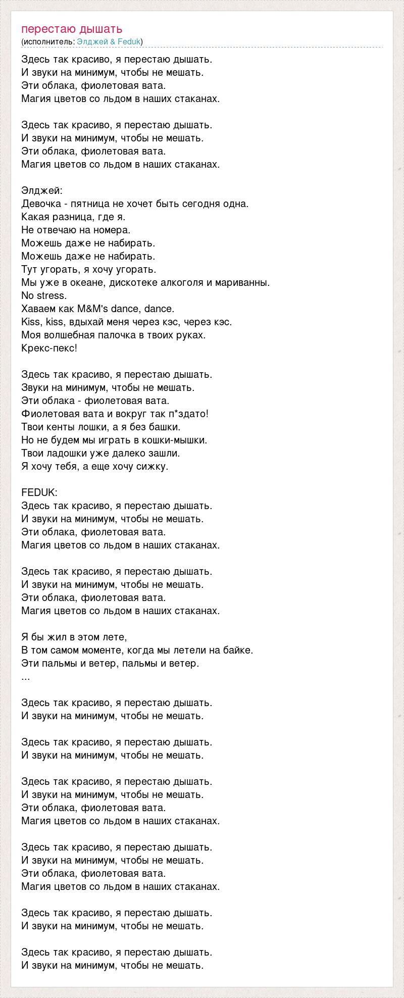 Здесь так красиво, я перестаю дышать. И звуки на минимум, чтобы не мешать. Эти облака, фиолетовая вата. Магия цветов со льдом в наших стаканах. Здесь так красиво, я перестаю дышать. И звуки на минимум, чтобы не мешать. Эти облака, фиолетовая вата. Магия цветов со льдом в наших стаканах. Элджей: Девочка - пятница не хочет быть сегодня одна. Какая разница, где я. Не отвечаю на номера. Можешь даже не набирать. Можешь даже не набирать. Тут угорать, я хочу угорать. Мы уже в океане, дискотеке алкоголя и мариванны. No stress. Хаваем как M&M's dance, dance. Kiss, kiss, вдыхай меня через кэс, через кэс. Моя волшебная палочка в твоих руках. Крекс-пекс! Здесь так красиво, я перестаю дышать. Звуки на минимум, чтобы не мешать. Эти облака - фиолетовая вата. Фиолетовая вата и вокруг так п*здато! Твои кенты лошки, а я без башки. Но не будем мы играть в кошки-мышки. Твои ладошки уже далеко зашли. Я хочу тебя, а еще хочу сижку. FEDUK: Здесь так красиво, я перестаю дышать. И звуки на минимум, чтобы не мешать. Эти облака, фиолетовая вата. Магия цветов со льдом в наших стаканах. Здесь так красиво, я перестаю дышать. И звуки на минимум, чтобы не мешать. Эти облака, фиолетовая вата. Магия цветов со льдом в наших стаканах. Я бы жил в этом лете, В том самом моменте, когда мы летели на байке. Эти пальмы и ветер, пальмы и ветер. ... Здесь так красиво, я перестаю дышать. И звуки на минимум, чтобы не мешать. Здесь так красиво, я перестаю дышать. И звуки на минимум, чтобы не мешать. Здесь так красиво, я перестаю дышать. И звуки на минимум, чтобы не мешать. Эти облака, фиолетовая вата. Магия цветов со льдом в наших стаканах. Здесь так красиво, я перестаю дышать. И звуки на минимум, чтобы не мешать. Эти облака, фиолетовая вата. Магия цветов со льдом в наших стаканах. Здесь так красиво, я перестаю дышать. И звуки на минимум, чтобы не мешать. Здесь так красиво, я перестаю дышать. И звуки на минимум, чтобы не мешать.