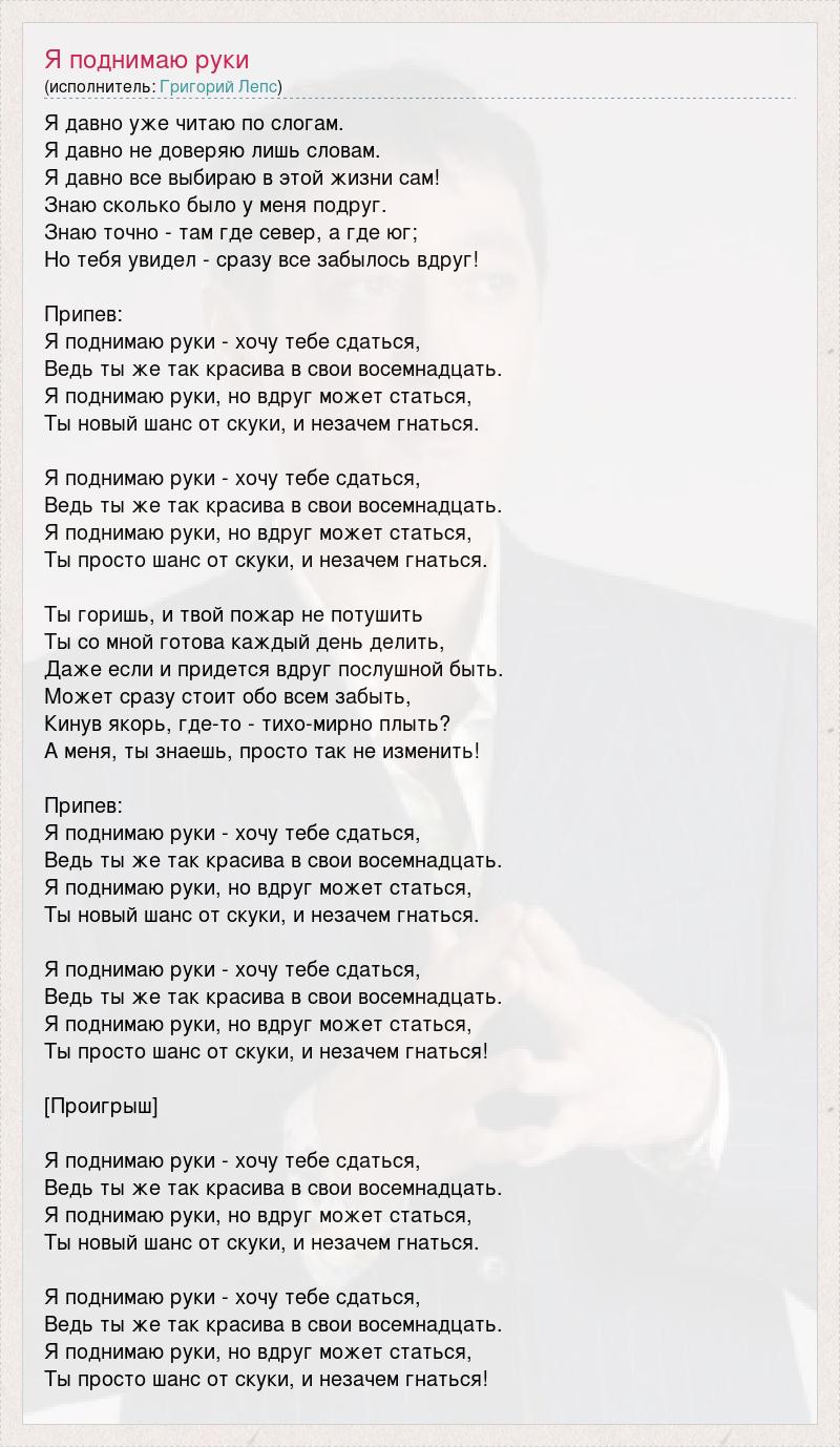 Я давно уже читаю по слогам. Я давно не доверяю лишь словам. Я давно все выбираю в этой жизни сам! Знаю сколько было у меня подруг. Знаю точно - там где север, а где юг; Но тебя увидел - сразу все забылось вдруг! Припев: Я поднимаю руки - хочу тебе сдаться, Ведь ты же так красива в свои восемнадцать. Я поднимаю руки, но вдруг может статься, Ты новый шанс от скуки, и незачем гнаться. Я поднимаю руки - хочу тебе сдаться, Ведь ты же так красива в свои восемнадцать. Я поднимаю руки, но вдруг может статься, Ты просто шанс от скуки, и незачем гнаться. Ты горишь, и твой пожар не потушить Ты со мной готова каждый день делить, Даже если и придется вдруг послушной быть. Может сразу стоит обо всем забыть, Кинув якорь, где-то - тихо-мирно плыть? А меня, ты знаешь, просто так не изменить! Припев: Я поднимаю руки - хочу тебе сдаться, Ведь ты же так красива в свои восемнадцать. Я поднимаю руки, но вдруг может статься, Ты новый шанс от скуки, и незачем гнаться. Я поднимаю руки - хочу тебе сдаться, Ведь ты же так красива в свои восемнадцать. Я поднимаю руки, но вдруг может статься, Ты просто шанс от скуки, и незачем гнаться! [Проигрыш] Я поднимаю руки - хочу тебе сдаться, Ведь ты же так красива в свои восемнадцать. Я поднимаю руки, но вдруг может статься, Ты новый шанс от скуки, и незачем гнаться. Я поднимаю руки - хочу тебе сдаться, Ведь ты же так красива в свои восемнадцать. Я поднимаю руки, но вдруг может статься, Ты просто шанс от скуки, и незачем гнаться!