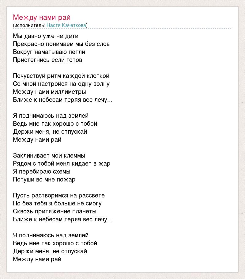 Мы давно уже не дети Прекрасно понимаем мы без слов Вокруг наматываю петли Пристегнись если готов Почувствуй ритм каждой клеткой Со мной настройся на одну волну Между нами миллиметры Ближе к небесам теряя вес лечу... Я поднимаюсь над землей Ведь мне так хорошо с тобой Держи меня, не отпускай Между нами рай Заклинивает мои клеммы Рядом с тобой меня кидает в жар Я перебираю схемы Потуши во мне пожар Пусть растворимся на рассвете Но без тебя я больше не смогу Сквозь притяжение планеты Ближе к небесам теряя вес лечу... Я поднимаюсь над землей Ведь мне так хорошо с тобой Держи меня, не отпускай Между нами рай