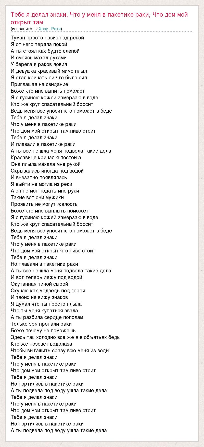 Туман просто навис над рекой Я от него теряла покой А ты стоял как будто слепой И смеясь махал руками У берега я раков ловил И девушка красивый мимо плыл Я стал кричать ей что было сил Приглашая на свидание Боже кто мне выпить поможет Я с гусиною кожей замерзаю в воде Кто же круг спасательный бросит Ведь меня все уносит кто поможет в беде Тебе я делал знаки Что у меня в пакетике раки Что дом мой открыт там пиво стоит Тебе я делал знаки И плавали в пакетике раки А ты все не шла меня подвела такие дела Красавице кричал я постой а Она плыла махала мне рукой Скрывалась иногда под водой И внезапно появлялась Я выйти не могла из реки А он не мог подать мне руки Такие вот они мужики Проявить не могут жалость Боже кто мне выплыть поможет Я с гусиною кожей замерзаю в воде Кто же круг спасательный бросит Ведь меня все уносит кто поможет в беде Тебе я делал знаки Что у меня в пакетике раки Что дом мой открыт что пиво стоит Тебе я делал знаки Но плавали в пакетике раки А ты все не шла меня подвела такие дела И вот теперь лежу под водой Окутанная тиной сырой Скучаю как медведь под горой И твоих не вижу знаков Я думал что ты просто плыла Что ты меня купаться звала А ты разбила сердце пополам Только зря пропали раки Боже почему не поможешь Здесь так холодно все же я в объятьях беды Кто же позовет водолаза Чтобы вытащить сразу всю меня из воды Тебе я делал знаки Что у меня в пакетике раки Что дом мой открыт там пиво стоит Тебе я делал знаки Но портились в пакетике раки А ты подвела под воду ушла такие дела Тебе я делал знаки Что у меня в пакетике раки Что дом мой открыт там пиво стоит Тебе я делал знаки Но портились в пакетике раки А ты подвела под воду ушла такие дела