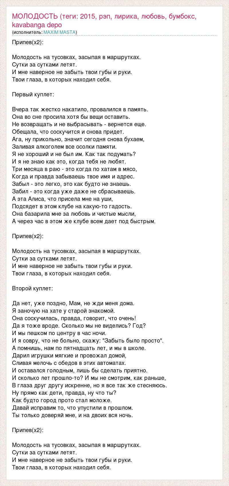 Припев(х2): Молодость на тусовках, засыпая в маршрутках. Сутки за сутками летят. И мне наверное не забыть твои губы и руки. Твои глаза, в которых находил себя. Первый куплет: Вчера так жестко накатило, провалился в память. Она во сне просила хотя бы вещи оставить. Не возвращать и не выбрасывать - вернется еще. Обещала, что соскучится и снова придет. Ага, ну прикольно, значит сегодня снова бухаем, Заливая алкоголем все осолки памяти. Я не хороший и не был им. Как так подумать? И я не знаю как это, когда тебя не любят. Три месяца в раю - это когда по хатам в мясо, Когда и правда забываешь твое имя и адрес. Забыл - это легко, это как будто не знаешь. Забил - это когда уже даже не сбрасываешь. А эта Алиса, что присела мне на уши, Подсядет в этом клубе на какую-то гадость. Она базарила мне за любовь и чистые мысли, А через час в этом же клубе всем дает под быстрым. Припев(х2): Молодость на тусовках, засыпая в маршрутках. Сутки за сутками летят. И мне наверное не забыть твои губы и руки. Твои глаза, в которых находил себя. Второй куплет: Да нет, уже поздно, Мам, не жди меня дома. Я заночую на хате у старой знакомой. Она соскучилась, правда, говорит, что очень! Да я тоже вроде. Сколько мы не виделись? Год? И мы пешком по центру в час ночи. И я совру, что не больно, скажу: "Забыть было просто". А помнишь, нам по пятнадцать лет, и мы в школе. Дарил игрушки мягкие и провожал домой, Сливая мелочь с обедов в этих автоматах. И оставался голодным, лишь бы сделать приятно. И сколько лет прошло-то? И мы не смотрим, как раньше, В глаза друг другу искренне, но я все так же стесняюсь. Ну прямо как дети, правда, ну что ты? Как будто город прото стал моложе. Давай исправим то, что упустили в прошлом. Ты только доверяй мне, и на двоих вся ночь. Припев(х2): Молодость на тусовках, засыпая в маршрутках. Сутки за сутками летят. И мне наверное не забыть твои губы и руки. Твои глаза, в которых находил себя.