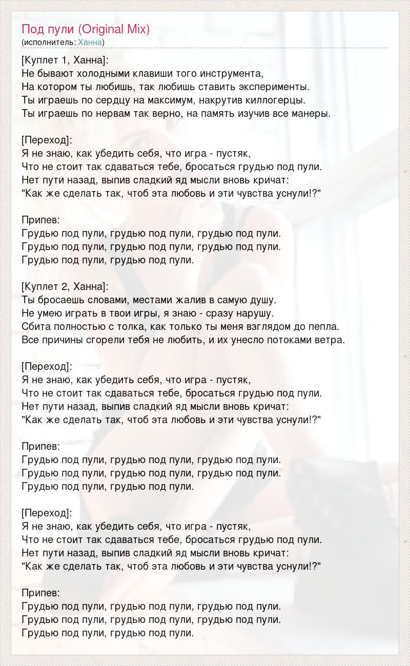[Куплет 1, Ханна]: Не бывают холодными клавиши того инструмента, На котором ты любишь, так любишь ставить эксперименты. Ты играешь по сердцу на максимум, накрутив киллогерцы. Ты играешь по нервам так верно, на память изучив все манеры. [Переход]: Я не знаю, как убедить себя, что игра - пустяк, Что не стоит так сдаваться тебе, бросаться грудью под пули. Нет пути назад, выпив сладкий яд мысли вновь кричат: "Как же сделать так, чтоб эта любовь и эти чувства уснули!?" Припев: Грудью под пули, грудью под пули, грудью под пули. Грудью под пули, грудью под пули, грудью под пули. Грудью под пули, грудью под пули. [Куплет 2, Ханна]: Ты бросаешь словами, местами жалив в самую душу. Не умею играть в твои игры, я знаю - сразу нарушу. Сбита полностью с толка, как только ты меня взглядом до пепла. Все причины сгорели тебя не любить, и их унесло потоками ветра. [Переход]: Я не знаю, как убедить себя, что игра - пустяк, Что не стоит так сдаваться тебе, бросаться грудью под пули. Нет пути назад, выпив сладкий яд мысли вновь кричат: "Как же сделать так, чтоб эта любовь и эти чувства уснули!?" Припев: Грудью под пули, грудью под пули, грудью под пули. Грудью под пули, грудью под пули, грудью под пули. Грудью под пули, грудью под пули. [Переход]: Я не знаю, как убедить себя, что игра - пустяк, Что не стоит так сдаваться тебе, бросаться грудью под пули. Нет пути назад, выпив сладкий яд мысли вновь кричат: "Как же сделать так, чтоб эта любовь и эти чувства уснули!?" Припев: Грудью под пули, грудью под пули, грудью под пули. Грудью под пули, грудью под пули, грудью под пули. Грудью под пули, грудью под пули.