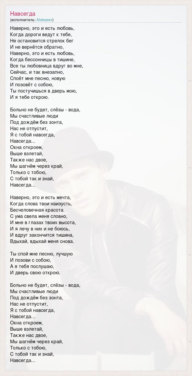 Наверно, это и есть любовь, Когда дороги ведут к тебе, Не остановится стрелок бег И не вернётся обратно, Наверно, это и есть любовь, Когда бессонницы в тишине, Все ты любовница вдруг во мне, Сейчас, и так внезапно, Споёт мне песню, новую И позовёт с собою, Ты постучишься в дверь мою, И я тебе открою. Больно не будет, слёзы - вода, Мы счастливые люди Под дождём без зонта, Нас не отпустит, Я с тобой навсегда, Навсегда... Окна откроем, Выше взлетай, Также нас двое, Мы шагнём через край, Только с тобою, С тобой так и знай, Навсегда... Наверно, это и есть мечта, Когда слова твои наизусть, Бесчеловечная красота С ума свела меня словно, И мне в глазах твоих высота, И я лечу в них и не боюсь, И вдруг закончится тишина, Вдыхай, вдыхай меня снова. Ты спой мне песню, лучшую И позови с собою, А я тебя послушаю, И дверь свою открою. Больно не будет, слёзы - вода, Мы счастливые люди Под дождём без зонта, Нас не отпустит, Я с тобой навсегда, Навсегда... Окна откроем, Выше взлетай, Также нас двое, Мы шагнём через край, Только с тобою, С тобой так и знай, Навсегда...