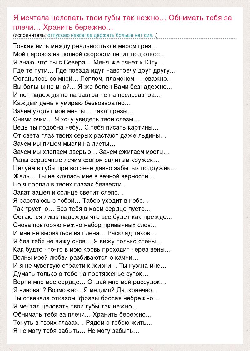 Тонкая нить между реальностью и миром грез… Мой паровоз на полной скорости летит под откос… Я знаю, что ты с Севера… Меня же тянет к Югу… Где те пути… Где поезда идут навстречу друг другу… Останьтесь со мной… Пеплом, пламенем – неважно… Вы больны не мной… Я же болен Вами безнадежно… И нет надежды не на завтра не на послезавтра… Каждый день я умираю безвозвратно… Зачем уходят мои мечты… Тают грезы… Сними очки… Я хочу увидеть твои слезы… Ведь ты подобна небу.. С тебя писать картины… От света глаз твоих серых растают даже льдины… Зачем мы пишем мысли на листы… Зачем мы хлопаем дверью… Зачем сжигаем мосты… Раны сердечные лечим фоном залитым кружек… Целуем в губы при встрече давно забытых подружек… Жаль… Ты не клялась мне в вечной верности… Но я пропал в твоих глазах безвести… Закат зашел и солнце светит слепо… Я расстаюсь с тобой… Табор уходит в небо… Так грустно… Без тебя в моем сердце пусто… Остаются лишь надежды что все будет как прежде… Снова повторяю нежно набор привычных слов… И мне не вырваться из плена… Расклад таков… Я без тебя не вижу снов… Я вижу только стены… Как будто что-то в мою кровь проходит через вены… Волны моей любви разбиваются о камни… И я не чувствую страсти к жизни… Ты нужна мне… Думать только о тебе на протяженье суток… Верни мне мое сердце… Отдай мне мой рассудок… Я виноват? Возможно.. Я медлил? Да, конечно… Ты отвечала отказом, фразы бросая небрежно… Я мечтал целовать твои губы так нежно… Обнимать тебя за плечи… Хранить бережно… Тонуть в твоих глазах… Рядом с тобою жить… Я не могу тебя забыть… Не могу забыть…