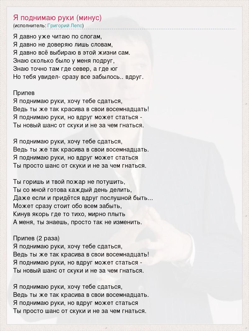 Я давно уже читаю по слогам, Я давно не доверяю лишь словам, Я давно всё выбираю в этой жизни сам. Знаю сколько было у меня подруг, Знаю точно там где север, а где юг Но тебя увидел- сразу все забылось.. вдруг. Припев Я поднимаю руки, хочу тебе сдаться, Ведь ты же так красива в свои восемнадцать! Я поднимаю руки, но вдруг может статься - Ты новый шанс от скуки и не за чем гнаться. Я поднимаю руки, хочу тебе сдаться, Ведь ты же так красива в свои восемнадцать. Я поднимаю руки, но вдруг может статься Ты просто шанс от скуки и не за чем гнаться. Ты горишь и твой пожар не потушить, Ты со мной готова каждый день делить, Даже если и придётся вдруг послушной быть... Может сразу стоит обо всем забыть, Кинув якорь где то тихо, мирно плыть А меня, ты знаешь, просто так не изменить. Припев (2 раза) Я поднимаю руки, хочу тебе сдаться, Ведь ты же так красива в свои восемнадцать! Я поднимаю руки, но вдруг может статься - Ты новый шанс от скуки и не за чем гнаться. Я поднимаю руки, хочу тебе сдаться, Ведь ты же так красива в свои восемнадцать. Я поднимаю руки, но вдруг может статься Ты просто шанс от скуки и не за чем гнаться.