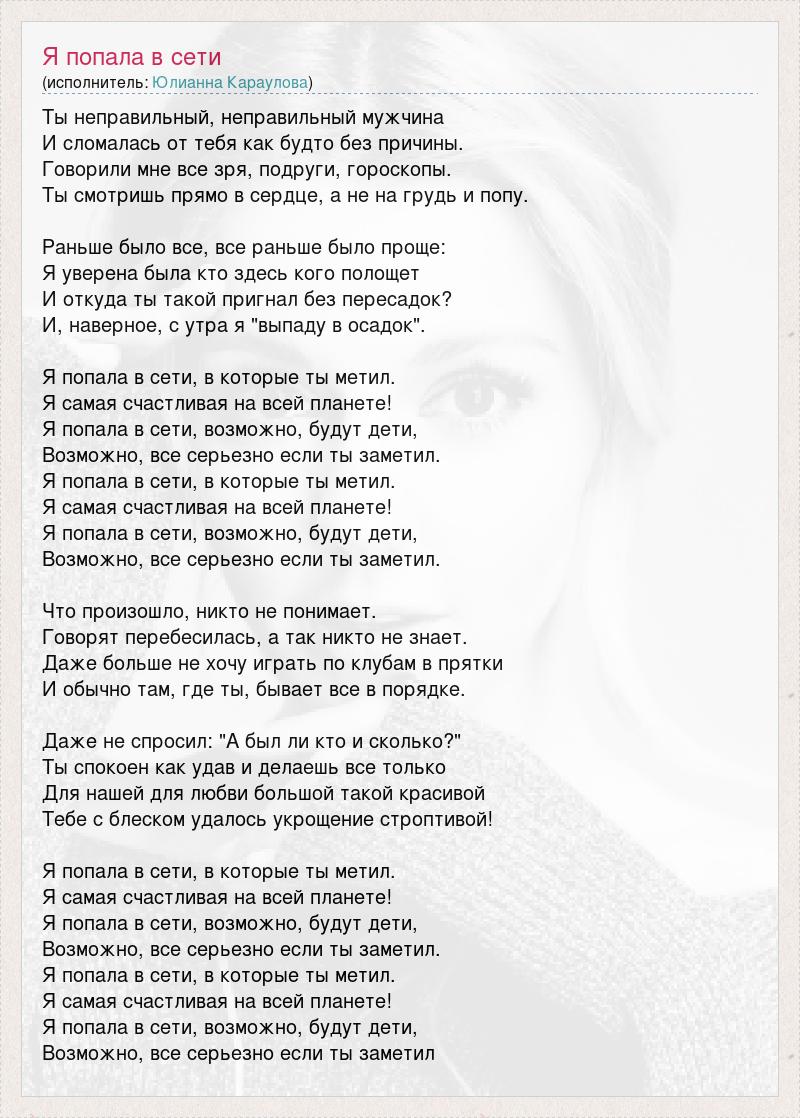 Ты неправильный, неправильный мужчина И сломалась от тебя как будто без причины. Говорили мне все зря, подруги, гороскопы. Ты смотришь прямо в сердце, а не на грудь и попу. Раньше было все, все раньше было проще: Я уверена была кто здесь кого полощет И откуда ты такой пригнал без пересадок? И, наверное, с утра я "выпаду в осадок". Я попала в сети, в которые ты метил. Я самая счастливая на всей планете! Я попала в сети, возможно, будут дети, Возможно, все серьезно если ты заметил. Я попала в сети, в которые ты метил. Я самая счастливая на всей планете! Я попала в сети, возможно, будут дети, Возможно, все серьезно если ты заметил. Что произошло, никто не понимает. Говорят перебесилась, а так никто не знает. Даже больше не хочу играть по клубам в прятки И обычно там, где ты, бывает все в порядке. Даже не спросил: "А был ли кто и сколько?" Ты спокоен как удав и делаешь все только Для нашей для любви большой такой красивой Тебе с блеском удалось укрощение строптивой! Я попала в сети, в которые ты метил. Я самая счастливая на всей планете! Я попала в сети, возможно, будут дети, Возможно, все серьезно если ты заметил. Я попала в сети, в которые ты метил. Я самая счастливая на всей планете! Я попала в сети, возможно, будут дети, Возможно, все серьезно если ты заметил