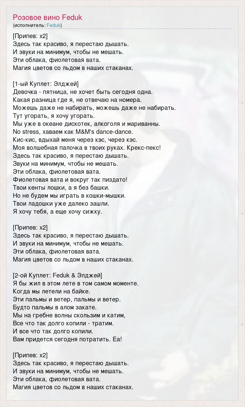 [Припев: х2] Здесь так красиво, я перестаю дышать. И звуки на минимум, чтобы не мешать. Эти облака, фиолетовая вата. Магия цветов со льдом в наших стаканах. [1-ый Куплет: Элджей] Девочка - пятница, не хочет быть сегодня одна. Какая разница где я, не отвечаю на номера. Можешь даже не набирать, можешь даже не набирать. Тут угорать, я хочу угорать. Мы уже в океане дискотек, алкоголя и мариванны. No stress, хаваем как M&M's dance-dance. Кис-кис, вдыхай меня через кэс, через кэс. Моя волшебная палочка в твоих руках. Крекс-пекс! Здесь так красиво, я перестаю дышать. Звуки на минимум, чтобы не мешать. Эти облака, фиолетовая вата. Фиолетовая вата и вокруг так пиздато! Твои кенты лошки, а я без башки. Но не будем мы играть в кошки-мышки. Твои ладошки уже далеко зашли. Я хочу тебя, а еще хочу сижку. [Припев: х2] Здесь так красиво, я перестаю дышать. И звуки на минимум, чтобы не мешать. Эти облака, фиолетовая вата. Магия цветов со льдом в наших стаканах. [2-ой Куплет: Feduk & Элджей] Я бы жил в этом лете в том самом моменте. Когда мы летели на байке. Эти пальмы и ветер, пальмы и ветер. Будто пальмы в алом закате. Мы на гребне волны скользим и катим, Все что так долго копили - тратим. И все что так долго копили. Вам придется сегодня потратить. Еа! [Припев: х2] Здесь так красиво, я перестаю дышать. И звуки на минимум, чтобы не мешать. Эти облака, фиолетовая вата. Магия цветов со льдом в наших стаканах.