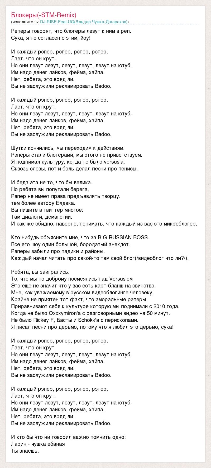 Реперы говорят, что блогеры лезут к ним в реп. Сука, я не согласен с этим, йоу! И каждый рэпер, рэпер, рэпер, рэпер. Лает, что он крут. Но они лезут лезут, лезут, лезут, лезут на ютуб. Им надо денег лайков, фейма, хайпа. Нет, ребята, это вряд ли. Вы не заслужили рекламировать Badoo. И каждый рэпер, рэпер, рэпер, рэпер. Лает, что он крут. Но они лезут лезут, лезут, лезут, лезут на ютуб. Им надо денег лайков, фейма, хайпа. Нет, ребята, это вряд ли. Вы не заслужили рекламировать Badoo. Шутки кончились, мы переходим к действиям. Рэперы стали блогерами, мы этого не приветствуем. Я поднимал культуру, когда не было versus'a. Cквозь слезы, пот и боль делал песни про пенисы. И беда эта не то, что бы велика. Hо ребята вы попутали берега. Рэпер не имеет права предъявлять творцу. тем более автору Елдака. Вы пишите в твиттер многое: Там диалоги, демагогии. И как же обидно, наверно, понимать, что каждый из вас это микроблогер. Кто нибудь объясните мне, что за BIG RUSSIAN BOSS. Все его шоу один большой, бородатый анекдот. Рэперы забыли про падики и районы. Каждый начал читать про какой-то там свой блог(/видеоблог что ли?/). Ребята, вы заигрались. То, что мы по доброму посмеялись над Versus'ом Это еще не значит что у вас есть карт-бланш на свинство. Мне, как уважаемому в русском видеоблогинге человеку, Крайне не приятен тот факт, что аморальные рэперы Приравнивают себя к культуре которую мы поднимали с 2010 года. Kогда не было Оxxxymiron'a с разговорными видео на 50 минут. Hе было Rickey F, Басты и Schokk'а с перископами. Я писал песни про дерьмо, потому что я любил это дерьмо, сука! И каждый рэпер, рэпер, рэпер, рэпер. Лает, что он крут Но они лезут лезут, лезут, лезут, лезут на ютуб. Им надо денег лайков, фейма, хайпа. Нет, ребята, это вряд ли. Вы не заслужили рекламировать Badoo. И каждый рэпер, рэпер, рэпер, рэпер. Лает, что он крут. Но они лезут лезут, лезут, лезут, лезут на ютуб. Им надо денег лайков, фейма, хайпа. Нет, ребята, это вряд ли. Вы не заслужили рекламировать Badoo. И кто бы что ни говорил важно помнить одно: Ларин - чушка ебаная Ты знаешь.