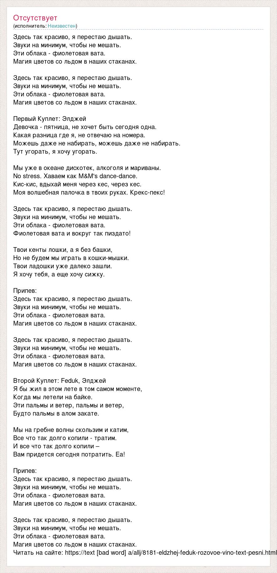 Здесь так красиво, я перестаю дышать. Звуки на минимум, чтобы не мешать. Эти облака - фиолетовая вата. Магия цветов со льдом в наших стаканах. Здесь так красиво, я перестаю дышать. Звуки на минимум, чтобы не мешать. Эти облака - фиолетовая вата. Магия цветов со льдом в наших стаканах. Первый Куплет: Элджей Девочка - пятница, не хочет быть сегодня одна. Какая разница где я, не отвечаю на номера. Можешь даже не набирать, можешь даже не набирать. Тут угорать, я хочу угорать. Мы уже в океане дискотек, алкоголя и мариваны. No stress. Хаваем как M&M's dance-dance. Кис-кис, вдыхай меня через кес, через кес. Моя волшебная палочка в твоих руках. Крекс-пекс! Здесь так красиво, я перестаю дышать. Звуки на минимум, чтобы не мешать. Эти облака - фиолетовая вата. Фиолетовая вата и вокруг так пиздато! Твои кенты лошки, а я без башки, Но не будем мы играть в кошки-мышки. Твои ладошки уже далеко зашли. Я хочу тебя, а еще хочу сижку. Припев: Здесь так красиво, я перестаю дышать. Звуки на минимум, чтобы не мешать. Эти облака - фиолетовая вата. Магия цветов со льдом в наших стаканах. Здесь так красиво, я перестаю дышать. Звуки на минимум, чтобы не мешать. Эти облака - фиолетовая вата. Магия цветов со льдом в наших стаканах. Второй Куплет: Feduk, Элджей Я бы жил в этом лете в том самом моменте, Когда мы летели на байке. Эти пальмы и ветер, пальмы и ветер, Будто пальмы в алом закате. Мы на гребне волны скользим и катим, Все что так долго копили - тратим. И все что так долго копили – Вам придется сегодня потратить. Еа! Припев: Здесь так красиво, я перестаю дышать. Звуки на минимум, чтобы не мешать. Эти облака - фиолетовая вата. Магия цветов со льдом в наших стаканах. Здесь так красиво, я перестаю дышать. Звуки на минимум, чтобы не мешать. Эти облака - фиолетовая вата. Магия цветов со льдом в наших стаканах. Читать на сайте: https://text [bad word] a/allj/8181-eldzhej-feduk-rozovoe-vino-text-pesni.html