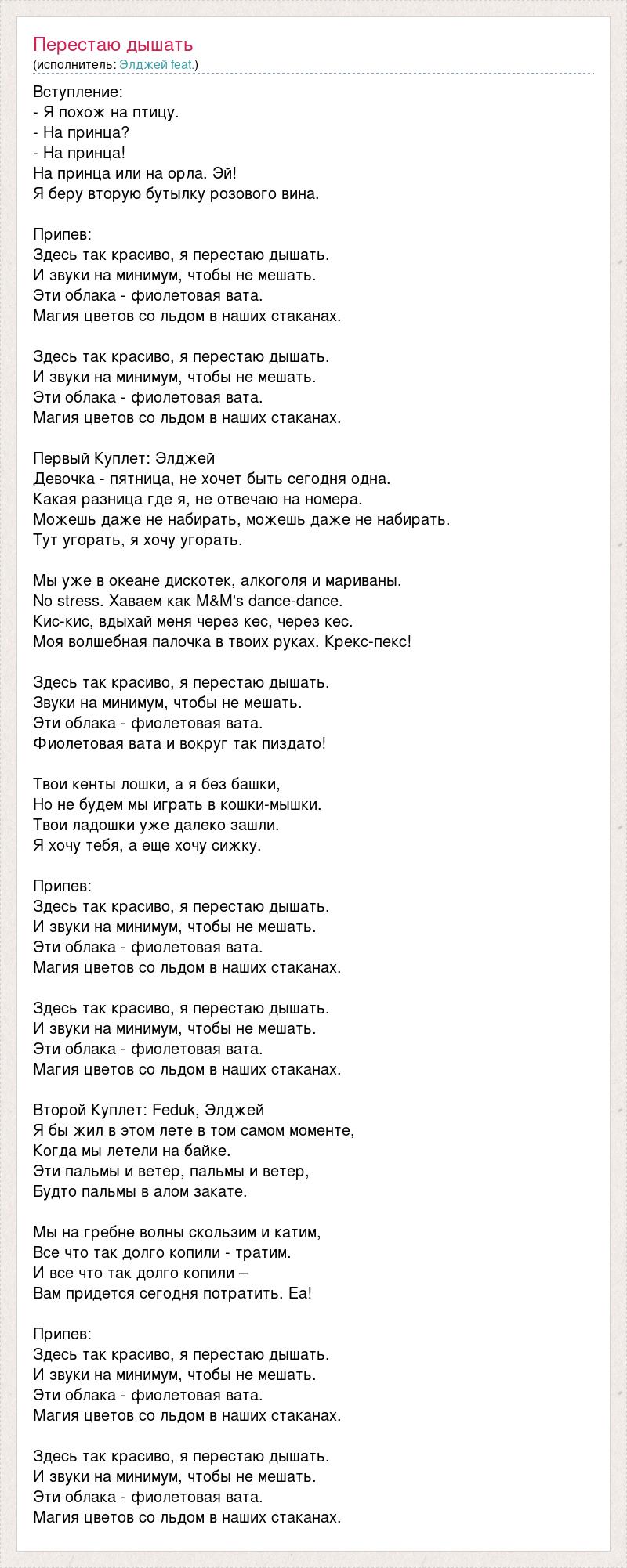 Вступление: - Я похож на птицу. - На принца? - На принца! На принца или на орла. Эй! Я беру вторую бутылку розового вина. Припев: Здесь так красиво, я перестаю дышать. И звуки на минимум, чтобы не мешать. Эти облака - фиолетовая вата. Магия цветов со льдом в наших стаканах. Здесь так красиво, я перестаю дышать. И звуки на минимум, чтобы не мешать. Эти облака - фиолетовая вата. Магия цветов со льдом в наших стаканах. Первый Куплет: Элджей Девочка - пятница, не хочет быть сегодня одна. Какая разница где я, не отвечаю на номера. Можешь даже не набирать, можешь даже не набирать. Тут угорать, я хочу угорать. Мы уже в океане дискотек, алкоголя и мариваны. No stress. Хаваем как M&M's dance-dance. Кис-кис, вдыхай меня через кес, через кес. Моя волшебная палочка в твоих руках. Крекс-пекс! Здесь так красиво, я перестаю дышать. Звуки на минимум, чтобы не мешать. Эти облака - фиолетовая вата. Фиолетовая вата и вокруг так пиздато! Твои кенты лошки, а я без башки, Но не будем мы играть в кошки-мышки. Твои ладошки уже далеко зашли. Я хочу тебя, а еще хочу сижку. Припев: Здесь так красиво, я перестаю дышать. И звуки на минимум, чтобы не мешать. Эти облака - фиолетовая вата. Магия цветов со льдом в наших стаканах. Здесь так красиво, я перестаю дышать. И звуки на минимум, чтобы не мешать. Эти облака - фиолетовая вата. Магия цветов со льдом в наших стаканах. Второй Куплет: Feduk, Элджей Я бы жил в этом лете в том самом моменте, Когда мы летели на байке. Эти пальмы и ветер, пальмы и ветер, Будто пальмы в алом закате. Мы на гребне волны скользим и катим, Все что так долго копили - тратим. И все что так долго копили – Вам придется сегодня потратить. Еа! Припев: Здесь так красиво, я перестаю дышать. И звуки на минимум, чтобы не мешать. Эти облака - фиолетовая вата. Магия цветов со льдом в наших стаканах. Здесь так красиво, я перестаю дышать. И звуки на минимум, чтобы не мешать. Эти облака - фиолетовая вата. Магия цветов со льдом в наших стаканах.