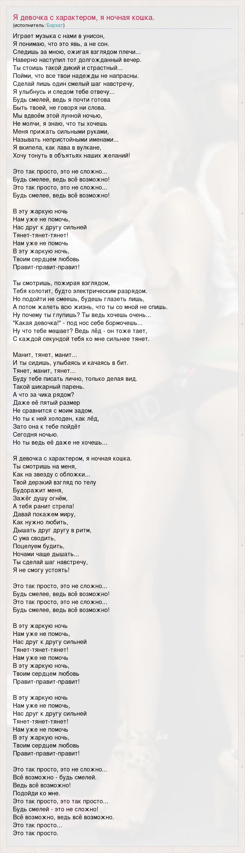 Играет музыка с нами в унисон, Я понимаю, что это явь, а не сон. Следишь за мною, ожигая взглядом плечи... Наверно наступил тот долгожданный вечер. Ты стоишь такой дикий и страстный... Пойми, что все твои надежды не напрасны. Сделай лишь один смелый шаг навстречу, Я улыбнусь и следом тебе отвечу... Будь смелей, ведь я почти готова Быть твоей, не говоря ни слова. Мы вдвоём этой лунной ночью, Не молчи, я знаю, что ты хочешь Меня прижать сильными руками, Называть непристойными именами... Я вкипела, как лава в вулкане, Хочу тонуть в объятьях наших желаний! Это так просто, это не сложно... Будь смелее, ведь всё возможно! Это так просто, это не сложно... Будь смелее, ведь всё возможно! В эту жаркую ночь Нам уже не помочь, Нас друг к другу сильней Тянет-тянет-тянет! Нам уже не помочь В эту жаркую ночь, Твоим сердцем любовь Правит-правит-правит! Ты смотришь, пожирая взглядом, Тебя колотит, будто электрическим разрядом. Но подойти не смеешь, будешь глазеть лишь, А потом жалеть всю жизнь, что ты со мной не спишь. Ну почему ты глупишь? Ты ведь хочешь очень... "Какая девочка!" - под нос себе бормочешь... Ну что тебе мешает? Ведь лёд - он тоже тает, С каждой секундой тебя ко мне сильнее тянет. Манит, тянет, манит... И ты сидишь, улыбаясь и качаясь в бит. Тянет, манит, тянет... Буду тебе писать лично, только делая вид. Такой шикарный парень. А что за чика рядом? Даже её пятый размер Не сравнится с моим задом. Но ты к ней холоден, как лёд, Зато она к тебе пойдёт Сегодня ночью. Но ты ведь её даже не хочешь... Я девочка с характером, я ночная кошка. Ты смотришь на меня, Как на звезду с обложки... Твой дерзкий взгляд по телу Будоражит меня, Зажёг душу огнём, А тебя ранит стрела! Давай покажем миру, Как нужно любить, Дышать друг другу в ритм, С ума сводить, Поцелуем будить, Ночами чаще дышать... Ты сделай шаг навстречу, Я не смогу устоять! Это так просто, это не сложно... Будь смелее, ведь всё возможно! Это так просто, это не сложно... Будь смелее, ведь всё возможно! В эту жаркую ночь Нам уже не помочь, Нас друг к другу сильней Тянет-тянет-тянет! Нам уже не помочь В эту жаркую ночь, Твоим сердцем любовь Правит-правит-правит! В эту жаркую ночь Нам уже не помочь, Нас друг к другу сильней Тянет-тянет-тянет! Нам уже не помочь В эту жаркую ночь, Твоим сердцем любовь Правит-правит-правит! Это так просто, это не сложно... Всё возможно - будь смелей. Ведь всё возможно! Подойди ко мне. Это так просто, это так просто... Будь смелей - это не сложно! Всё возможно, ведь всё возможно. Это так просто... Это так просто.