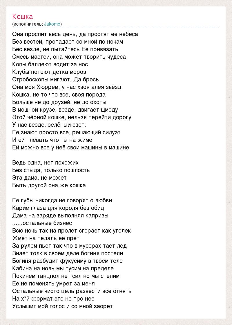 Она проспит весь день, да простят ее небеса Без вестей, пропадает со мной по ночам Бес везде, не пытайтесь Ее привязать Смесь мастей, она может творить чудеса Копы балдеют водит за нос Клубы потеют детка мороз Стробоскопы мигают, Да брось Она моя Хюррем, у нас хвоя алея звёзд Кошка, не то что все, своя порода Больше не до друзей, не до охоты В мощной крузе, везде, двигает щмоду Этой чёрной кошке, нельзя перейти дорогу У нас везде, зелёный свет, Ее знают просто все, решающий силуэт И ей плевать что ты на жиме Ей можно все у неё свои машины в машине Ведь одна, нет похожих Без стыда, только пошлость Эта дама, не может Быть другой она же кошка Ее губы никогда не говорят о любви Карие глаза для короля без обид Дама на заряде выполнял капризы ......остальные бизнес Всю ночь так на пролет сгорает как уголек Жмет на педаль ее прет За рулем пьет так что в мусорах тает лед Знает толк в своем деле богиня постели Богиня разбудит фукусиму в твоем теле Кабина на ноль мы тусим на пределе Покинем танцпол нет сил но мы стелим Ее не поменять умрет за меня Остальные чисто цель развести все отнять На х*й формат это не про нее Услышит мой голос и со мной заорет