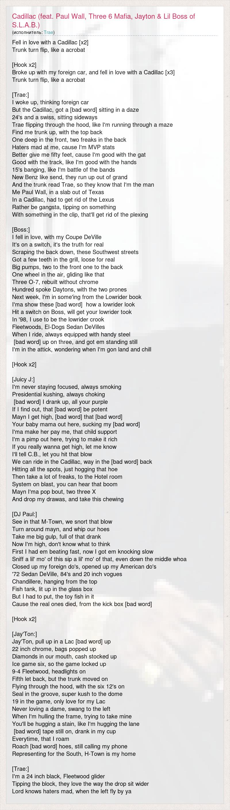 Fell in love with a Cadillac [x2] Trunk turn flip, like a acrobat [Hook x2] Broke up with my foreign car, and fell in love with a Cadillac [x3] Trunk turn flip, like a acrobat [Trae:] I woke up, thinking foreign car But the Cadillac, got a [bad word] sitting in a daze 24's and a swiss, sitting sideways Trae flipping through the hood, like I'm running through a maze Find me trunk up, with the top back One deep in the front, two freaks in the back Haters mad at me, cause I'm MVP stats Better give me fifty feet, cause I'm good with the gat Good with the track, like I'm good with the hands 15's banging, like I'm battle of the bands New Benz like send, they run up out of grand And the trunk read Trae, so they know that I'm the man Me Paul Wall, in a slab out of Texas In a Cadillac, had to get rid of the Lexus Rather be gangsta, tipping on something With something in the clip, that'll get rid of the plexing [Boss:] I fell in love, with my Coupe DeVille It's on a switch, it's the truth for real Scraping the back down, these Southwest streets Got a few teeth in the grill, loose for real Big pumps, two to the front one to the back One wheel in the air, gliding like that Three O-7, rebuilt without chrome Hundred spoke Daytons, with the two prones Next week, I'm in some'ing from the Lowrider book I'ma show these [bad word] how a lowrider look Hit a switch on Boss, will get your lowrider took In '98, I use to be the lowrider crook Fleetwoods, El-Dogs Sedan DeVilles When I ride, always equipped with handy steel [bad word] up on three, and got em standing still I'm in the attick, wondering when I'm gon land and chill [Hook x2] [Juicy J:] I'm never staying focused, always smoking Presidential kushing, always choking [bad word] I drank up, all your purple If I find out, that [bad word] be potent Mayn I get high, [bad word] that [bad word] Your baby mama out here, sucking my [bad word] I'ma make her pay me, that child support I'm a pimp out here, trying to make it rich If you really wanna get high, let me know I'll tell C.B., let you hit that blow We can ride in the Cadillac, way in the [bad word] back Hitting all the spots, just hogging that hoe Then take a lot of freaks, to the Hotel room System on blast, you can hear that boom Mayn I'ma pop bout, two three X And drop my drawas, and take this chewing [DJ Paul:] See in that M-Town, we snort that blow Turn around mayn, and whip our hoes Take me big gulp, full of that drank Now I'm high, don't know what to think First I had em beating fast, now I got em knocking slow Sniff a lil' mo' of this sip a lil' mo' of that, even down the middle whoa Closed up my foreign do's, opened up my American do's '72 Sedan DeVille, 84's and 20 inch vogues Chandillere, hanging from the top Fish tank, lit up in the glass box But I had to put, the toy fish in it Cause the real ones died, from the kick box [bad word] [Hook x2] [Jay'Ton:] Jay'Ton, pull up in a Lac [bad word] up 22 inch chrome, bags popped up Diamonds in our mouth, cash stocked up Ice game six, so the game locked up 9-4 Fleetwood, headlights on Fifth let back, but the trunk moved on Flying through the hood, with the six 12's on Seal in the groove, super kush to the dome 19 in the game, only love for my Lac Never loving a dame, swang to the left When I'm hulling the frame, trying to take mine You'll be hugging a stain, like I'm hugging the lane [bad word] tape still on, drank in my cup Everytime, that I roam Roach [bad word] hoes, still calling my phone Representing for the South, H-Town is my home [Trae:] I'm a 24 inch black, Fleetwood glider Tipping the block, they love the way the drop sit wider Lord knows haters mad, when the left fly by ya