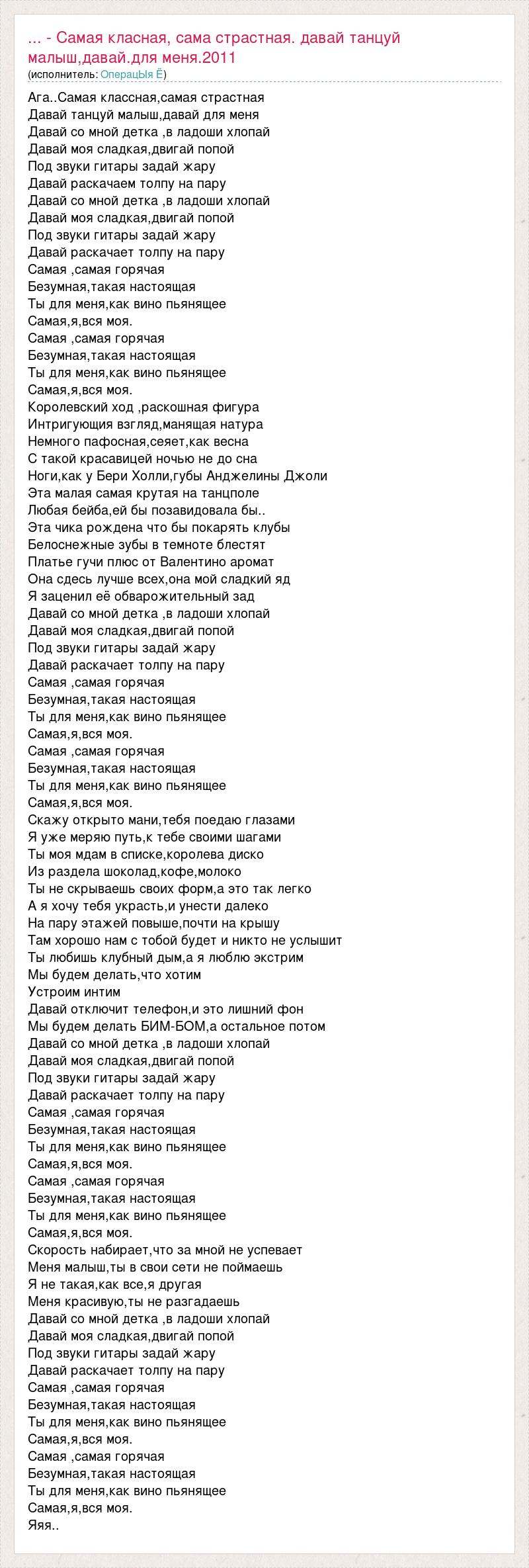 Ага..Самая классная,самая страстная Давай танцуй малыш,давай для меня Давай со мной детка ,в ладоши хлопай Давай моя сладкая,двигай попой Под звуки гитары задай жару Давай раскачаем толпу на пару Давай со мной детка ,в ладоши хлопай Давай моя сладкая,двигай попой Под звуки гитары задай жару Давай раскачает толпу на пару Самая ,самая горячая Безумная,такая настоящая Ты для меня,как вино пьянящее Самая,я,вся моя. Самая ,самая горячая Безумная,такая настоящая Ты для меня,как вино пьянящее Самая,я,вся моя. Королевский ход ,раскошная фигура Интригующия взгляд,манящая натура Немного пафосная,сеяет,как весна С такой красавицей ночью не до сна Ноги,как у Бери Холли,губы Анджелины Джоли Эта малая самая крутая на танцполе Любая бейба,ей бы позавидовала бы.. Эта чика рождена что бы покарять клубы Белоснежные зубы в темноте блестят Платье гучи плюс от Валентино аромат Она сдесь лучше всех,она мой сладкий яд Я заценил её обварожительный зад Давай со мной детка ,в ладоши хлопай Давай моя сладкая,двигай попой Под звуки гитары задай жару Давай раскачает толпу на пару Самая ,самая горячая Безумная,такая настоящая Ты для меня,как вино пьянящее Самая,я,вся моя. Самая ,самая горячая Безумная,такая настоящая Ты для меня,как вино пьянящее Самая,я,вся моя. Скажу открыто мани,тебя поедаю глазами Я уже меряю путь,к тебе своими шагами Ты моя мдам в списке,королева диско Из раздела шоколад,кофе,молоко Ты не скрываешь своих форм,а это так легко А я хочу тебя украсть,и унести далеко На пару этажей повыше,почти на крышу Там хорошо нам с тобой будет и никто не услышит Ты любишь клубный дым,а я люблю экстрим Мы будем делать,что хотим Устроим интим Давай отключит телефон,и это лишний фон Мы будем делать БИМ-БОМ,а остальное потом Давай со мной детка ,в ладоши хлопай Давай моя сладкая,двигай попой Под звуки гитары задай жару Давай раскачает толпу на пару Самая ,самая горячая Безумная,такая настоящая Ты для меня,как вино пьянящее Самая,я,вся моя. Самая ,самая горячая Безумная,такая настоящая Ты для меня,как вино пьянящее Самая,я,вся моя. Скорость набирает,что за мной не успевает Меня малыш,ты в свои сети не поймаешь Я не такая,как все,я другая Меня красивую,ты не разгадаешь Давай со мной детка ,в ладоши хлопай Давай моя сладкая,двигай попой Под звуки гитары задай жару Давай раскачает толпу на пару Самая ,самая горячая Безумная,такая настоящая Ты для меня,как вино пьянящее Самая,я,вся моя. Самая ,самая горячая Безумная,такая настоящая Ты для меня,как вино пьянящее Самая,я,вся моя. Яяя..