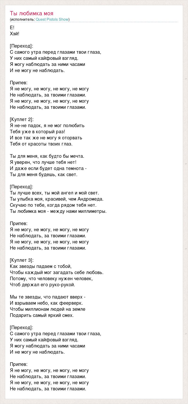 Е! Хэй! [Переход]: С самого утра перед глазами твои глаза, У них самый кайфовый взгляд. Я могу наблюдать за ними часами И не могу не наблюдать. Припев: Я не могу, не могу, не могу, не могу Не наблюдать, за твоими глазами. Я не могу, не могу, не могу, не могу Не наблюдать, за твоими глазами. [Куплет 2]: Я не-не падок, я не мог полюбить Тебя уже в который раз! И все так же не могу я оторвать Тебя от красоты твоих глаз. Ты для меня, как будто бы мечта. Я уверен, что лучше тебя нет! И даже если будет одна темнота - Ты для меня будешь, как свет. [Переход]: Ты лучше всех, ты мой ангел и мой свет. Ты улыбка моя, красивей, чем Андромеда. Скучаю по тебе, когда рядом тебя нет. Ты любимка моя - между нами миллиметры. Припев: Я не могу, не могу, не могу, не могу Не наблюдать, за твоими глазами. Я не могу, не могу, не могу, не могу Не наблюдать, за твоими глазами. [Куплет 3]: Как звезды падаем с тобой, Чтобы каждый мог загадать себе любовь. Потому, что человеку нужен человек, Чтоб держал его руко-рукой. Мы те звезды, что падают вверх - И взрываем небо, как феерверк. Чтобы миллионам людей на земле Подарить самый яркий смех. [Переход]: С самого утра перед глазами твои глаза, У них самый кайфовый взгляд. Я могу наблюдать за ними часами И не могу не наблюдать. Припев: Я не могу, не могу, не могу, не могу Не наблюдать, за твоими глазами. Я не могу, не могу, не могу, не могу Не наблюдать, за твоими глазами.