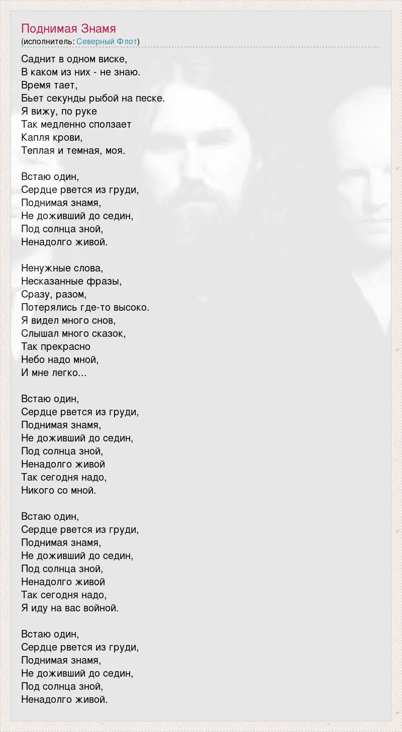 Саднит в одном виске, В каком из них - не знаю. Время тает, Бьет секунды рыбой на песке. Я вижу, по руке Так медленно сползает Капля крови, Теплая и темная, моя. Встаю один, Сердце рвется из груди, Поднимая знамя, Не доживший до седин, Под солнца зной, Ненадолго живой. Ненужные слова, Несказанные фразы, Сразу, разом, Потерялись где-то высоко. Я видел много снов, Слышал много сказок, Так прекрасно Небо надо мной, И мне легко... Встаю один, Сердце рвется из груди, Поднимая знамя, Не доживший до седин, Под солнца зной, Ненадолго живой Так сегодня надо, Никого со мной. Встаю один, Сердце рвется из груди, Поднимая знамя, Не доживший до седин, Под солнца зной, Ненадолго живой Так сегодня надо, Я иду на вас войной. Встаю один, Сердце рвется из груди, Поднимая знамя, Не доживший до седин, Под солнца зной, Ненадолго живой.