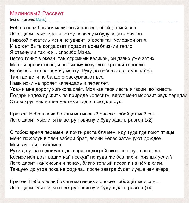 Небо в ночи брызги малиновый рассвет обойдёт мой сон. Лето дарит мысли,я на ветру повисну и буду ждать разгон. Никакой писатель меня не удивит, я воспитан мелодией огня. И может быть когда свет подарит моим близким тепло Я отвечу им так же .. спасибо Мама. Ветер гонит в океан, там огромный великан, он давно уже затих Ман.. и просит план, я по тихому лечу, мою крылья тороплю Ба-боюсь, что на-намочу манту..Руку до небес это атаман и бес Там где дети по балде е раскуривают вес, Наши ночи на пролет календарь и переплет. Укажи мне дорогу хип-хопа слёт. Моя -ая твоя лесть я "воин" во жиесть Подари надежду жить по природе колесить, вдруг меня морозит звук передай Это вокруг нам напел местный гид, я пою для рук. Припев: Небо в ночи брызги малиновый рассвет обойдёт мой сон... Лето дарит мысли, я на ветру повисну и буду ждать разгон (х2) С тобою время перемен ,я почти раста бля мен, иду туда где поют птицы Меня пожалуй в плен забери брат, воины небес затанцуют дождём. Моя -ая - ая - ая камон. Руки до утра поднимает детвора, подогрей свою сестру.. навсегда Космос моя друг видим мы" поскуд" но куда же без них и грязных услуг? Лето дарит нам сиськи и понам, благо теплый песок и на нём в хлам. Танцуем до утра пока не родила.. после завтра будет лучше чем вчера Припев: Небо в ночи брызги малиновый рассвет обойдёт мой сон... Лето дарит мысли, я на ветру повисну и буду ждать разгон (х4)