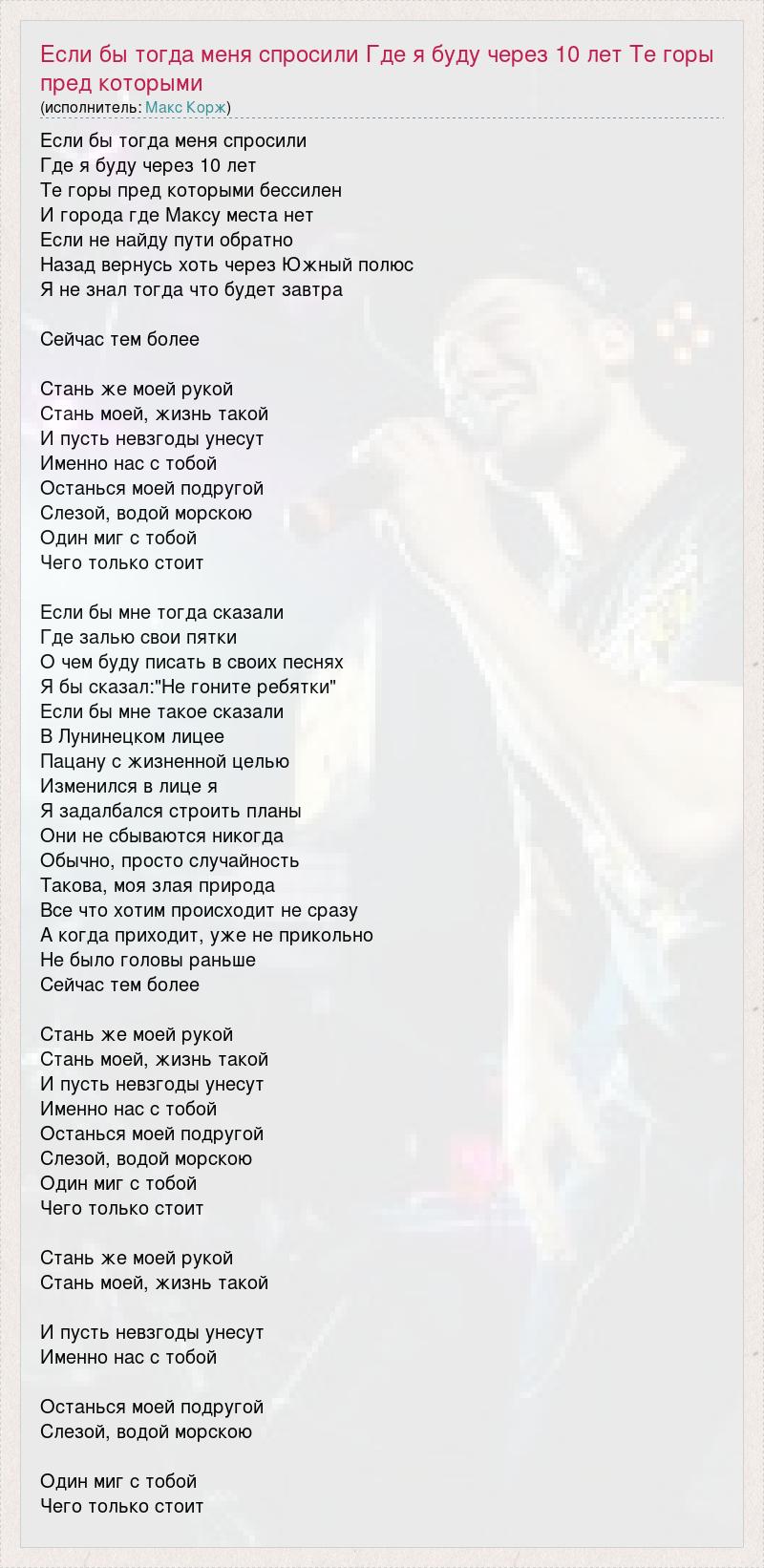 Если бы тогда меня спросили Где я буду через 10 лет Те горы пред которыми бессилен И города где Максу места нет Если не найду пути обратно Назад вернусь хоть через Южный полюс Я не знал тогда что будет завтра Сейчас тем более Стань же моей рукой Стань моей, жизнь такой И пусть невзгоды унесут Именно нас с тобой Останься моей подругой Слезой, водой морскою Один миг с тобой Чего только стоит Если бы мне тогда сказали Где залью свои пятки О чем буду писать в своих песнях Я бы сказал:"Не гоните ребятки" Если бы мне такое сказали В Лунинецком лицее Пацану с жизненной целью Изменился в лице я Я задалбался строить планы Они не сбываются никогда Обычно, просто случайность Такова, моя злая природа Все что хотим происходит не сразу А когда приходит, уже не прикольно Не было головы раньше Сейчас тем более Стань же моей рукой Стань моей, жизнь такой И пусть невзгоды унесут Именно нас с тобой Останься моей подругой Слезой, водой морскою Один миг с тобой Чего только стоит Стань же моей рукой Стань моей, жизнь такой И пусть невзгоды унесут Именно нас с тобой Останься моей подругой Слезой, водой морскою Один миг с тобой Чего только стоит