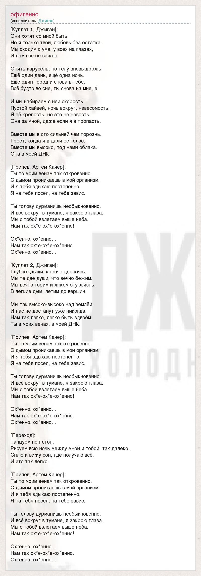 [Куплет 1, Джиган]: Они хотят со мной быть, Но я только твой, любовь без остатка. Мы сходим с ума, у всех на глазах, И нам все не важно. Опять карусель, по телу вновь дрожь. Ещё один день, ещё одна ночь. Ещё один город и снова в тебе. Всё будто во сне, ты снова на мне, е! И мы набираем с ней скорость. Пустой хайвей, ночь вокруг, невесомость. Я её крепость, но это не новость. Она за мной, даже если я в пропасть. Вместе мы в сто сильней чем порознь. Греет, когда я в дали её голос. Вместе мы высоко, под нами облака. Она в моей ДНК. [Припев, Артем Качер]: Ты по моим венам так откровенно. С дымом проникаешь в мой организм. И я тебя вдыхаю постепенно. Я на тебя посел, на тебе завис. Ты голову дурманишь необыкновенно. И всё вокруг в тумане, я закрою глаза. Мы с тобой взлетаем выше неба. Нам так ох*е-ох*е-ох*енно! Ох*енно. ох*енно… Нам так ох*е-ох*е-ох*енно. Ох*енно. ох*енно… [Куплет 2, Джиган]: Глубже дыши, крепче держись. Мы те две души, что вечно бежим. Мы вечно горим и жжём эту жизнь. В легкие дым, летим до вершин. Мы так высоко-высоко над землёй. И нас не достанут уже никогда. Нам так легко, легко быть вдвоём. Ты в моих венах, в моей ДНК. [Припев, Артем Качер]: Ты по моим венам так откровенно. С дымом проникаешь в мой организм. И я тебя вдыхаю постепенно. Я на тебя посел, на тебе завис. Ты голову дурманишь необыкновенно. И всё вокруг в тумане, я закрою глаза. Мы с тобой взлетаем выше неба. Нам так ох*е-ох*е-ох*енно! Ох*енно. ох*енно… Нам так ох*е-ох*е-ох*енно. Ох*енно. ох*енно… [Переход]: Танцуем нон-стоп. Рисуем всю ночь между мной и тобой, так далеко. Сплю и вижу сон, где получаю всё, И это так легко. [Припев, Артем Качер]: Ты по моим венам так откровенно. С дымом проникаешь в мой организм. И я тебя вдыхаю постепенно. Я на тебя посел, на тебе завис. Ты голову дурманишь необыкновенно. И всё вокруг в тумане, я закрою глаза. Мы с тобой взлетаем выше неба. Нам так ох*е-ох*е-ох*енно! Ох*енно. ох*енно… Нам так ох*е-ох*е-ох*енно. Ох*енно. ох*енно…