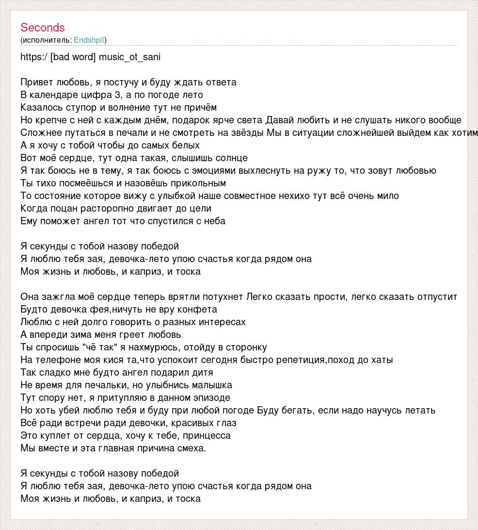 https:/ [bad word] music_ot_sani Привет любовь, я постучу и буду ждать ответа В календаре цифра 3, а по погоде лето Казалось ступор и волнение тут не причём Но крепче с ней с каждым днём, подарок ярче света Давай любить и не слушать никого вообще Сложнее путаться в печали и не смотреть на звёзды Мы в ситуации сложнейшей выйдем как хотим А я хочу с тобой чтобы до самых белых Вот моё сердце, тут одна такая, слышишь солнце Я так боюсь не в тему, я так боюсь с эмоциями выхлеснуть на ружу то, что зовут любовью Ты тихо посмеёшься и назовёшь прикольным То состояние которое вижу с улыбкой наше совместное нехихо тут всё очень мило Когда поцан расторопно двигает до цели Ему поможет ангел тот что спустился с неба Я секунды с тобой назову победой Я люблю тебя зая, девочка-лето упою счастья когда рядом она Моя жизнь и любовь, и каприз, и тоска Она зажгла моё сердце теперь врятли потухнет Легко сказать прости, легко сказать отпустит Будто девочка фея,ничуть не вру конфета Люблю с ней долго говорить о разных интересах А впереди зима меня греет любовь Ты спросишь "чё так" я нахмурюсь, отойду в сторонку На телефоне моя кися та,что успокоит сегодня быстро репетиция,поход до хаты Так сладко мне будто ангел подарил дитя Не время для печальки, но улыбнись малышка Тут спору нет, я притупляю в данном эпизоде Но хоть убей люблю тебя и буду при любой погоде Буду бегать, если надо научусь летать Всё ради встречи ради девочки, красивых глаз Это куплет от сердца, хочу к тебе, принцесса Мы вместе и эта главная причина смеха. Я секунды с тобой назову победой Я люблю тебя зая, девочка-лето упою счастья когда рядом она Моя жизнь и любовь, и каприз, и тоска