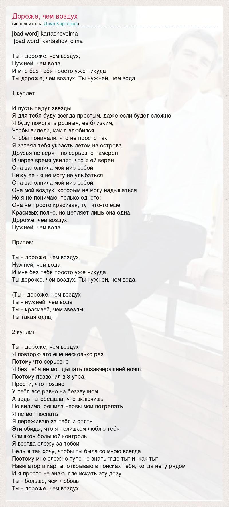 [bad word] kartashovdima [bad word] kartashov_dima Ты - дороже, чем воздух, Нужней, чем вода И мне без тебя просто уже никуда Ты дороже, чем воздух. Ты нужней, чем вода. 1 куплет И пусть падут звезды Я для тебя буду всегда простым, даже если будет сложно Я буду помогать родным, ее близким, Чтобы видели, как я влюбился Чтобы понимали, что не просто так Я затеял тебя украсть летом на острова Друзья не верят, но серьезно намерен И через время увидят, что я ей верен Она заполнила мой мир собой Вижу ее - я не могу не улыбаться Она заполнила мой мир собой Она мой воздух, которым не могу надышаться Но я не понимаю, только одного: Она не просто красивая, тут что-то еще Красивых полно, но цепляет лишь она одна Дороже, чем воздух Нужней, чем вода Припев: Ты - дороже, чем воздух, Нужней, чем вода И мне без тебя просто уже никуда Ты дороже, чем воздух. Ты нужней, чем вода. (Ты - дороже, чем воздух Ты - нужней, чем вода Ты - красивей, чем звезды, Ты такая одна) 2 куплет Ты - дороже, чем воздух Я повторю это еще несколько раз Потому что серьезно Я без тебя не мог дышать позавчерашней ночm. Поэтому позвонил в 3 утра, Прости, что поздно У тебя все равно на беззвучном А ведь ты обещала, что включишь Но видимо, решила нервы мои потрепать Я не мог поспать Я переживаю за тебя и опять Эти обиды, что я - слишком люблю тебя Слишком большой контроль Я всегда слежу за тобой Ведь я так хочу, чтобы ты была со мною всегда Поэтому мне сложно тупо не знать "где ты" и "как ты" Навигатор и карты, открываю в поисках тебя, когда нету рядом И я просто не знаю, где искать эту дозу Ты - больше, чем любовь Ты - дороже, чем воздух