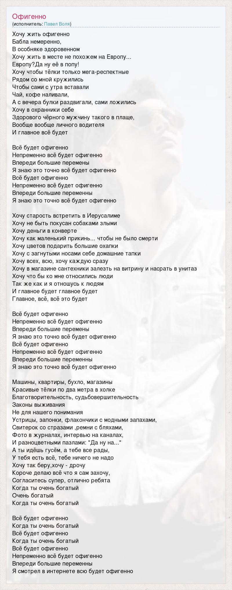 Хочу жить офигенно Бабла немеренно, В особняке здоровенном Хочу жить в месте не похожем на Европу... Европу?Да ну её в попу! Хочу чтобы тёлки только мега-респектные Рядом со мной кружились Чтобы сами с утра вставали Чай, кофе наливали, А с вечера булки раздвигали, сами ложились Хочу в охранники себе Здорового чёрного мужчину такого в плаще, Вообще вообще личного водителя И главное всё будет Всё будет офигенно Непременно всё будет офигенно Впереди большие перемены Я знаю это точно всё будет офигенно Всё будет офигенно Непременно всё будет офигенно Впереди большие переменны Я знаю это точно всё будет офигенно Хочу старость встретить в Иерусалиме Хочу не быть покусан собаками злыми Хочу деньги в конверте Хочу как маленький прикинь... чтобы не было смерти Хочу цветов подарить большие охапки Хочу с загнутыми носами себе домашние тапки Хочу всех, всю, хочу каждую сразу Хочу в магазине сантехники залезть на витрину и насрать в унитаз Хочу что бы ко мне относились люди Так же как и я отношусь к людям И главное будет главное будет Главное, всё, всё это будет Всё будет офигенно Непременно всё будет офигенно Впереди большие перемены Я знаю это точно всё будет офигенно Всё будет офигенно Непременно всё будет офигенно Впереди большие переменны Я знаю это точно всё будет офигенно Машины, квартиры, бухло, магазины Красивые тёлки по два метра в холке Благотворительность, судьбовершительность Законы выживания Не для нашего понимания Устрицы, запонки, флакончики с модными запахами, Свитерок со стразами ,ремни с бляхами, Фото в журналах, интервью на каналах, И разноцветными пазлами: "Да ну на..." А ты идёшь гусём, а тебе все рады, У тебя есть всё, тебе ничего не надо Хочу так беру,хочу - дрочу Короче делаю всё что я сам захочу, Согласитесь супер, отлично ребята Когда ты очень богатый Очень богатый Когда ты очень богатый Всё будет офигенно Когда ты очень богатый Всё будет офигенно Когда ты очень богатый Всё будет офигенно Непременно всё будет офигенно Впереди большие переменны Я смотрел в интернете всю будет офигенно