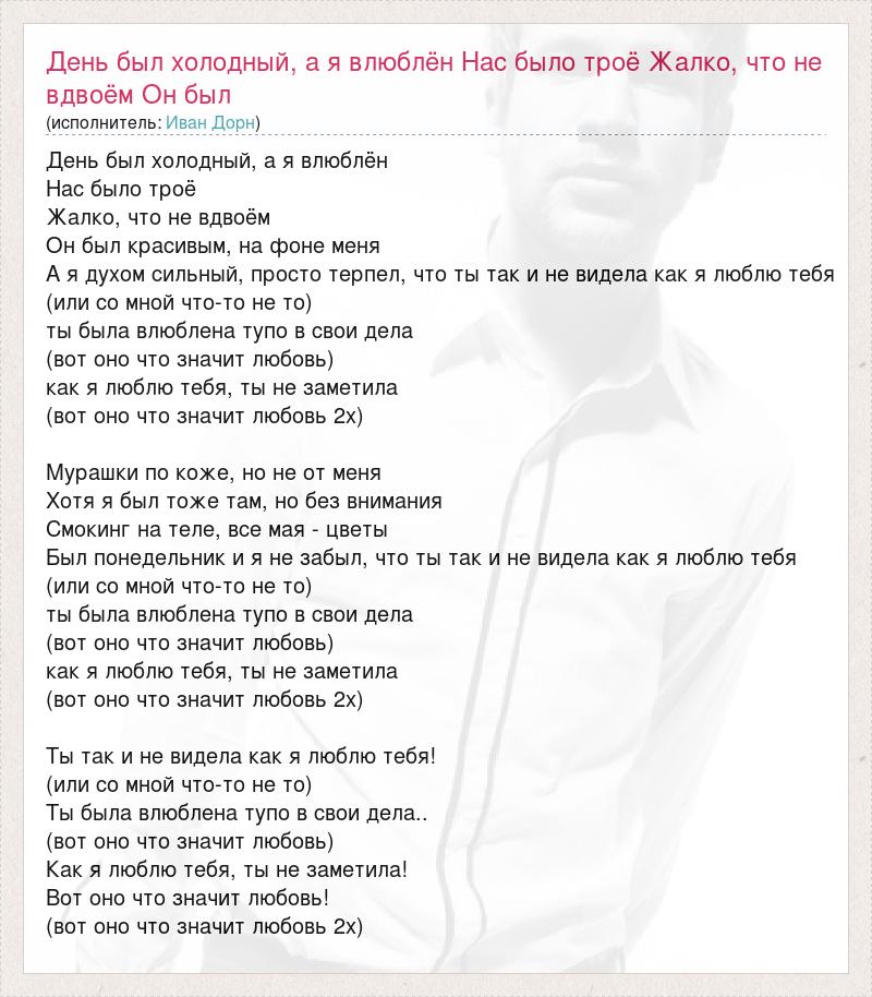День был холодный, а я влюблён Нас было троё Жалко, что не вдвоём Он был красивым, на фоне меня А я духом сильный, просто терпел, что ты так и не видела как я люблю тебя (или со мной что-то не то) ты была влюблена тупо в свои дела (вот оно что значит любовь) как я люблю тебя, ты не заметила (вот оно что значит любовь 2х) Мурашки по коже, но не от меня Хотя я был тоже там, но без внимания Смокинг на теле, все мая - цветы Был понедельник и я не забыл, что ты так и не видела как я люблю тебя (или со мной что-то не то) ты была влюблена тупо в свои дела (вот оно что значит любовь) как я люблю тебя, ты не заметила (вот оно что значит любовь 2х) Ты так и не видела как я люблю тебя! (или со мной что-то не то) Ты была влюблена тупо в свои дела.. (вот оно что значит любовь) Как я люблю тебя, ты не заметила! Вот оно что значит любовь! (вот оно что значит любовь 2х)