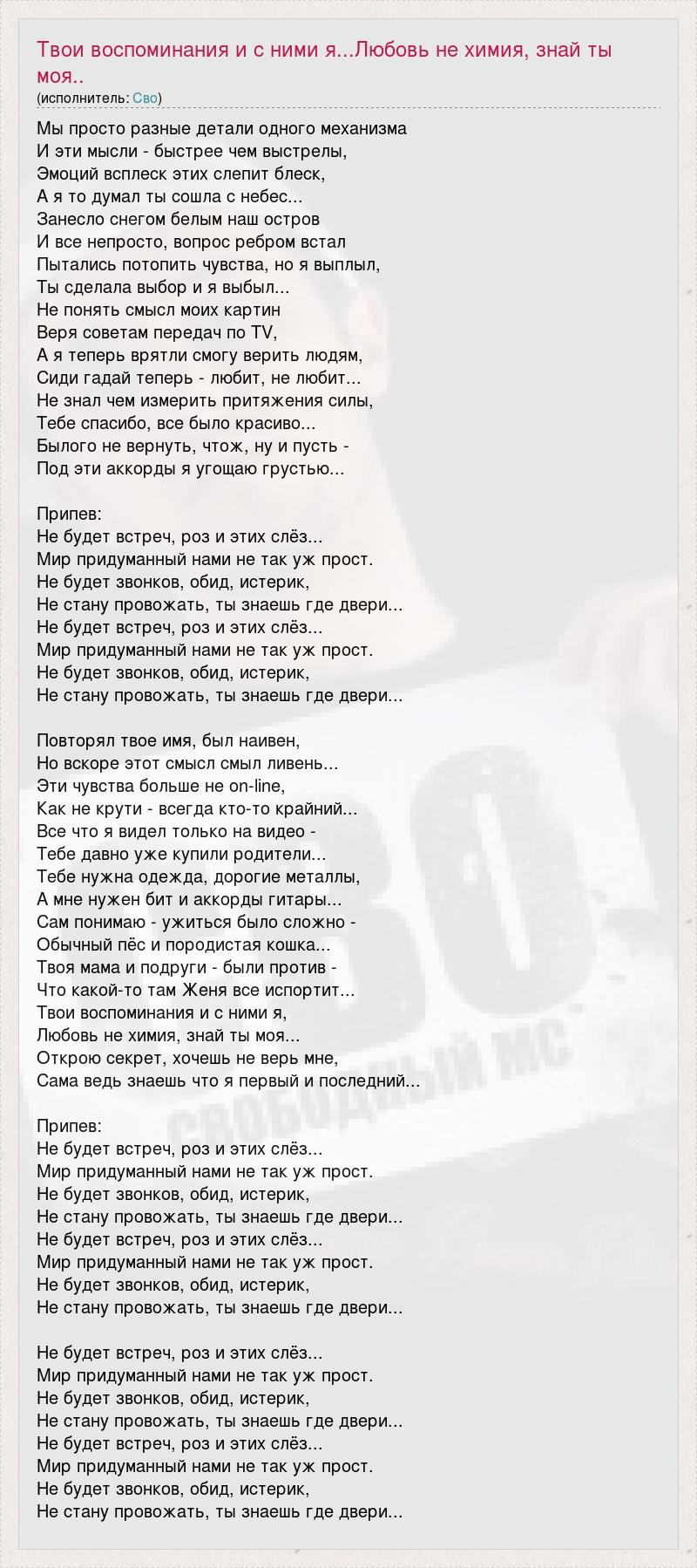 Мы просто разные детали одного механизма И эти мысли - быстрее чем выстрелы, Эмоций всплеск этих слепит блеск, А я то думал ты сошла с небес... Занесло снегом белым наш остров И все непросто, вопрос ребром встал Пытались потопить чувства, но я выплыл, Ты сделала выбор и я выбыл... Не понять смысл моих картин Веря советам передач по TV, А я теперь врятли смогу верить людям, Сиди гадай теперь - любит, не любит... Не знал чем измерить притяжения силы, Тебе спасибо, все было красиво... Былого не вернуть, чтож, ну и пусть - Под эти аккорды я угощаю грустью... Припев: Не будет встреч, роз и этих слёз... Мир придуманный нами не так уж прост. Не будет звонков, обид, истерик, Не стану провожать, ты знаешь где двери... Не будет встреч, роз и этих слёз... Мир придуманный нами не так уж прост. Не будет звонков, обид, истерик, Не стану провожать, ты знаешь где двери... Повторял твое имя, был наивен, Но вскоре этот смысл смыл ливень... Эти чувства больше не on-line, Как не крути - всегда кто-то крайний... Все что я видел только на видео - Тебе давно уже купили родители... Тебе нужна одежда, дорогие металлы, А мне нужен бит и аккорды гитары... Сам понимаю - ужиться было сложно - Обычный пёс и породистая кошка... Твоя мама и подруги - были против - Что какой-то там Женя все испортит... Твои воспоминания и с ними я, Любовь не химия, знай ты моя... Открою секрет, хочешь не верь мне, Сама ведь знаешь что я первый и последний... Припев: Не будет встреч, роз и этих слёз... Мир придуманный нами не так уж прост. Не будет звонков, обид, истерик, Не стану провожать, ты знаешь где двери... Не будет встреч, роз и этих слёз... Мир придуманный нами не так уж прост. Не будет звонков, обид, истерик, Не стану провожать, ты знаешь где двери... Не будет встреч, роз и этих слёз... Мир придуманный нами не так уж прост. Не будет звонков, обид, истерик, Не стану провожать, ты знаешь где двери... Не будет встреч, роз и этих слёз... Мир придуманный нами не так уж прост. Не будет звонков, обид, истерик, Не стану провожать, ты знаешь где двери...