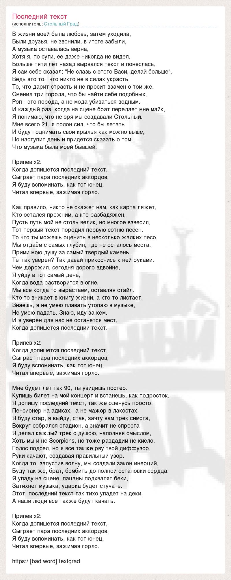 В жизни моей была любовь, затем уходила, Были друзья, не звонили, в итоге забыли, А музыка оставалась верна, Хотя я, по сути, ее даже никогда не видел. Больше пяти лет назад вырвался текст и понеслась, Я сам себе сказал: "Не слазь с этого Васи, делай больше", Ведь это то, что никто не в силах украсть, То, что дарит страсть и не просит взамен о том же. Сменил три города, что бы найти себе подобных, Рэп - это порода, а не мода убиваться водным. И каждый раз, когда на сцене брат передает мне майк, Я понимаю, что не зря мы создавали Стольный. Мне всего 21, я полон сил, что бы летать И буду поднимать свои крылья как можно выше, Но наступит день и придется сказать о том, Что музыка была моей бывшей. Припев х2: Когда допишется последний текст, Сыграет пара последних аккордов, Я буду вспоминать, как тот юнец, Читал впервые, зажимая горло. Как правило, никто не скажет нам, как карта ляжет, Кто остался прежним, а кто разбадяжен, Пусть путь мой не столь велик, но многое взвесил, Тот первый текст породил первую сотню песен. То что ты можешь оценить в несколько жалких песо, Мы отдаём с самых глубин, где не осталось места. Прими мою душу за самый твердый камень. Ты так уверен? Так давай прикоснись к ней руками. Чем дорожил, сегодня дорого вдвойне, Я уйду в тот самый день, Когда вода растворится в огне, Мы все когда то вырастаем, оставляя стайл. Кто то вникает в книгу жизни, а кто то листает. Знаешь, я не умею плавать утопаю в музыке, Не умею падать. Знаю, иду за кем. И я уверен для нас не останется мест, Когда допишется последний текст. Припев х2: Когда допишется последний текст, Сыграет пара последних аккордов, Я буду вспоминать, как тот юнец, Читал впервые, зажимая горло. Мне будет лет так 90, ты увидишь постер. Купишь билет на мой концерт и встанешь, как подросток. Я допишу последний текст, так же оденусь просто: Пенсионер на адиках, а не мажор в лакостах. Я буду стар, я выйду, став, зачту вам трек симста, Вокруг собрался стадион, а значит не спроста Я делал каждый трек с душою, наполняя смыслом, Хоть мы и не Scorpions, но тоже раздадим не кисло. Голос подсел, но я все также рву твой диффузор, Руки качают, создавая правильный узор. Когда то, запустив волну, мы создали закон инерций, Буду так же, брат, бомбить до полной остановки сердца. Я упаду на сцене, пацаны подхватят беки, Затихнет музыка, ударка будет стучать. Этот последний текст так тихо упадет на деки, А наши люди все также будут качать. Припев х2: Когда допишется последний текст, Сыграет пара последних аккордов, Я буду вспоминать, как тот юнец, Читал впервые, зажимая горло. https:/ [bad word] textgrad