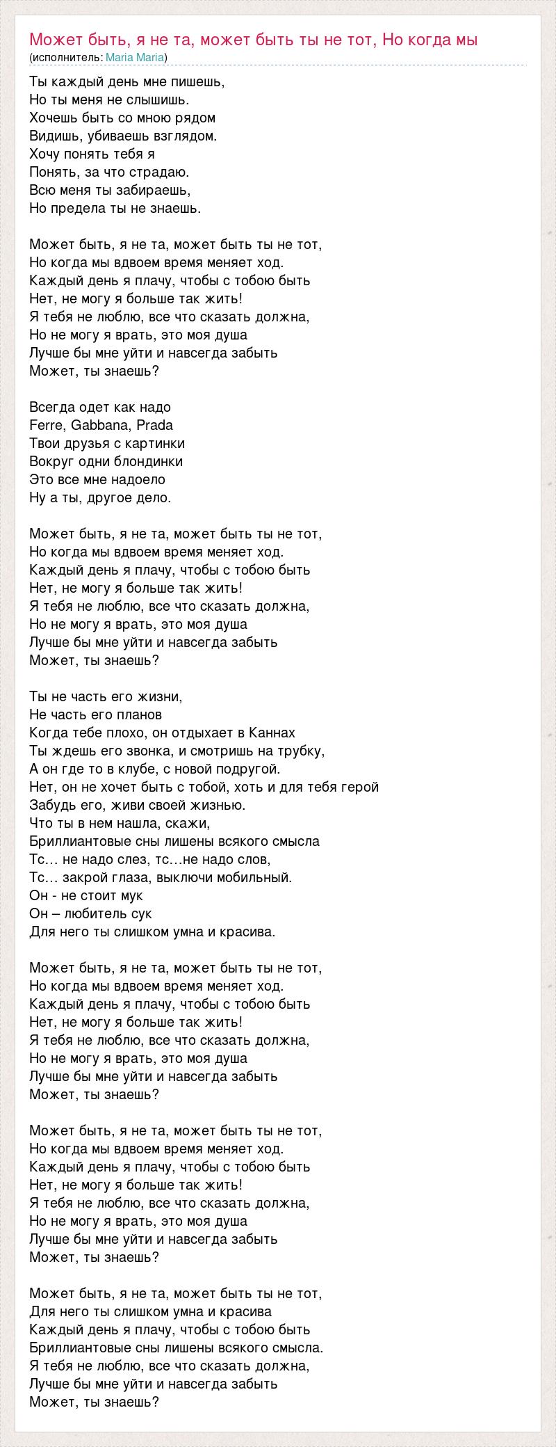 Ты каждый день мне пишешь, Но ты меня не слышишь. Хочешь быть со мною рядом Видишь, убиваешь взглядом. Хочу понять тебя я Понять, за что страдаю. Всю меня ты забираешь, Но предела ты не знаешь. Может быть, я не та, может быть ты не тот, Но когда мы вдвоем время меняет ход. Каждый день я плачу, чтобы с тобою быть Нет, не могу я больше так жить! Я тебя не люблю, все что сказать должна, Но не могу я врать, это моя душа Лучше бы мне уйти и навсегда забыть Может, ты знаешь? Всегда одет как надо Ferre, Gabbana, Prada Твои друзья с картинки Вокруг одни блондинки Это все мне надоело Ну а ты, другое дело. Может быть, я не та, может быть ты не тот, Но когда мы вдвоем время меняет ход. Каждый день я плачу, чтобы с тобою быть Нет, не могу я больше так жить! Я тебя не люблю, все что сказать должна, Но не могу я врать, это моя душа Лучше бы мне уйти и навсегда забыть Может, ты знаешь? Ты не часть его жизни, Не часть его планов Когда тебе плохо, он отдыхает в Каннах Ты ждешь его звонка, и смотришь на трубку, А он где то в клубе, с новой подругой. Нет, он не хочет быть с тобой, хоть и для тебя герой Забудь его, живи своей жизнью. Что ты в нем нашла, скажи, Бриллиантовые сны лишены всякого смысла Тс… не надо слез, тс…не надо слов, Тс… закрой глаза, выключи мобильный. Он - не стоит мук Он – любитель сук Для него ты слишком умна и красива. Может быть, я не та, может быть ты не тот, Но когда мы вдвоем время меняет ход. Каждый день я плачу, чтобы с тобою быть Нет, не могу я больше так жить! Я тебя не люблю, все что сказать должна, Но не могу я врать, это моя душа Лучше бы мне уйти и навсегда забыть Может, ты знаешь? Может быть, я не та, может быть ты не тот, Но когда мы вдвоем время меняет ход. Каждый день я плачу, чтобы с тобою быть Нет, не могу я больше так жить! Я тебя не люблю, все что сказать должна, Но не могу я врать, это моя душа Лучше бы мне уйти и навсегда забыть Может, ты знаешь? Может быть, я не та, может быть ты не тот, Для него ты слишком умна и красива Каждый день я плачу, чтобы с тобою быть Бриллиантовые сны лишены всякого смысла. Я тебя не люблю, все что сказать должна, Лучше бы мне уйти и навсегда забыть Может, ты знаешь?