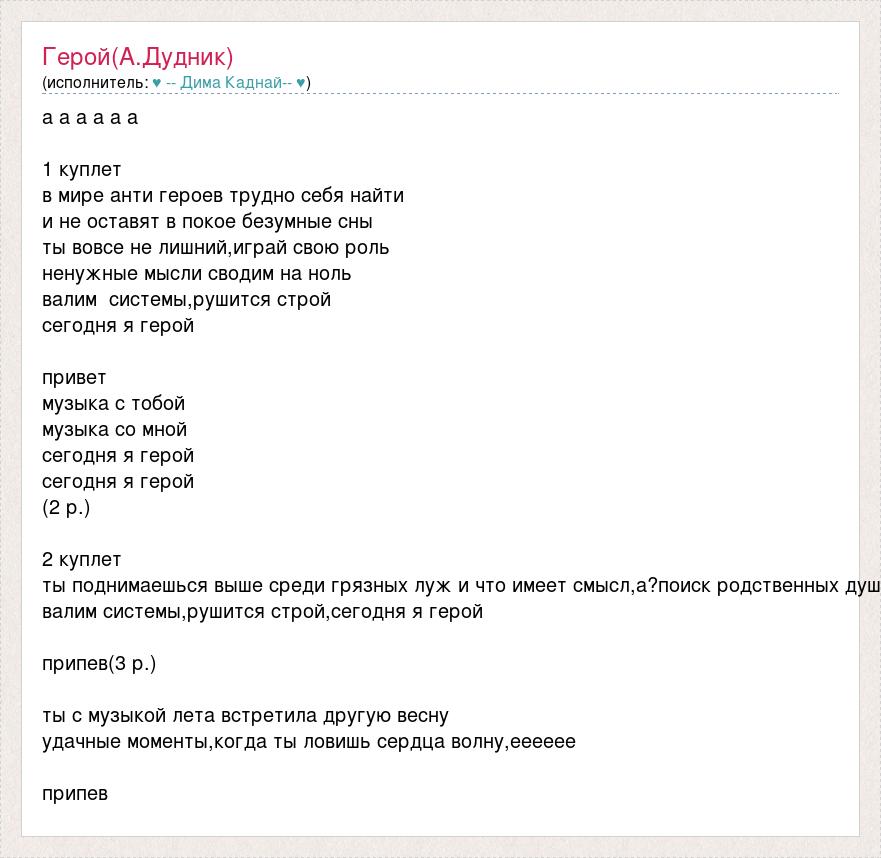 а а а а а а 1 куплет в мире анти героев трудно себя найти и не оставят в покое безумные сны ты вовсе не лишний,играй свою роль ненужные мысли сводим на ноль валим системы,рушится строй сегодня я герой привет музыка с тобой музыка со мной сегодня я герой сегодня я герой (2 р.) 2 куплет ты поднимаешься выше среди грязных луж и что имеет смысл,а?поиск родственных душ валим системы,рушится строй,сегодня я герой припев(3 р.) ты с музыкой лета встретила другую весну удачные моменты,когда ты ловишь сердца волну,ееееее припев