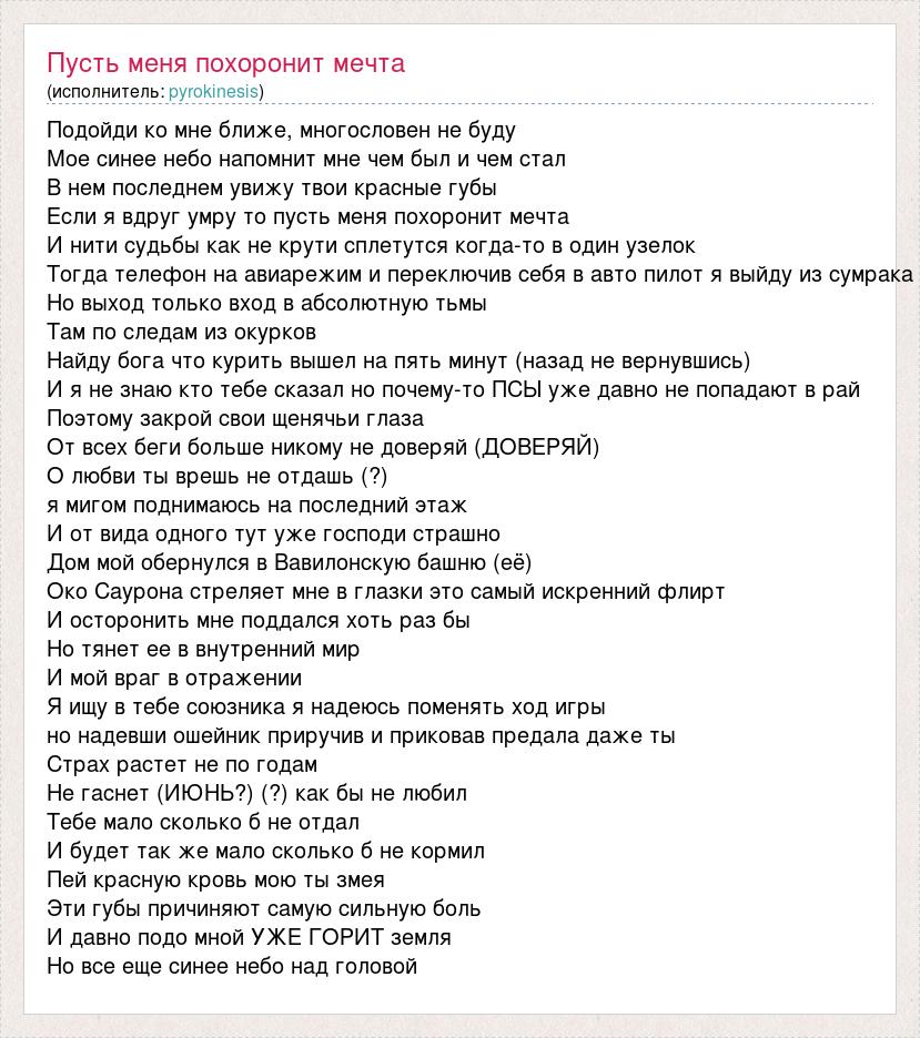 Подойди ко мне ближе, многословен не буду Мое синее небо напомнит мне чем был и чем стал В нем последнем увижу твои красные губы Если я вдруг умру то пусть меня похоронит мечта И нити судьбы как не крути сплетутся когда-то в один узелок Тогда телефон на авиарежим и переключив себя в авто пилот я выйду из сумрака Но выход только вход в абсолютную тьмы Там по следам из окурков Найду бога что курить вышел на пять минут (назад не вернувшись) И я не знаю кто тебе сказал но почему-то ПСЫ уже давно не попадают в рай Поэтому закрой свои щенячьи глаза От всех беги больше никому не доверяй (ДОВЕРЯЙ) О любви ты врешь не отдашь (?) я мигом поднимаюсь на последний этаж И от вида одного тут уже господи страшно Дом мой обернулся в Вавилонскую башню (её) Око Саурона стреляет мне в глазки это самый искренний флирт И осторонить мне поддался хоть раз бы Но тянет ее в внутренний мир И мой враг в отражении Я ищу в тебе союзника я надеюсь поменять ход игры но надевши ошейник приручив и приковав предала даже ты Страх растет не по годам Не гаснет (ИЮНЬ?) (?) как бы не любил Тебе мало сколько б не отдал И будет так же мало сколько б не кормил Пей красную кровь мою ты змея Эти губы причиняют самую сильную боль И давно подо мной УЖЕ ГОРИТ земля Но все еще синее небо над головой