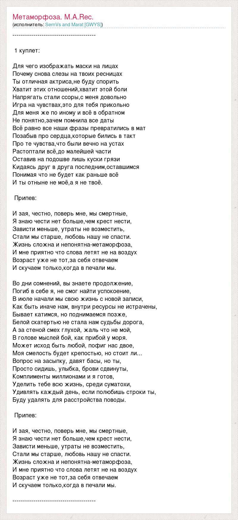 ---------------------------------------- 1 куплет: Для чего изображать маски на лицах Почему снова слезы на твоих ресницах Ты отличная актриса,не буду спорить Хватит этих отношений,хватит этой боли Напрягать стали ссоры,с меня довольно Игра на чувствах,это для тебя прикольно Для меня же по иному и всё в обратном Не понятно,зачем помнила все даты Всё равно все наши фразы превратились в мат Позабыв про сердца,которые бились в такт Про те чувства,что были вечно на устах Растоптали всё,до малейшей части Оставив на подошве лишь куски грязи Кидаясь друг в друга последним,оставшимся Понимая что не будет как раньше всё И ты отныне не моё,а я не твоё. Припев: И зая, честно, поверь мне, мы смертные, Я знаю чести нет больше,чем крест нести, Зависти меньше, утраты не возместить, Стали мы старше, любовь нашу не спасти. Жизнь сложна и непонятна-метаморфоза, И мне приятно что слова летят не на воздух Возраст уже не тот,за себя отвечаем И скучаем только,когда в печали мы. Во дни сомнений, вы знаете продолжение, Погиб в себе я, не смог найти успокоение, В июле начали мы свою жизнь с новой записи, Как быть иначе нам, внутри ресурсы не истрачены, Бывает катимся, но поднимаемся позже, Белой скатертью не стала нам судьбы дорога, А за стеной смех глухой, жаль что не мой, В голове мыслей бой, как прибой у моря. Может исход быть любой, пофиг нас двое, Моя смелость будет крепостью, но стоит ли... Вопрос на засыпку, давят басы, но ты, Просто сидишь, улыбка, брови сдвинуты, Комплименты миллионами и я готов, Уделить тебе всю жизнь, среди суматохи, Удивлять каждый день, если полюбишь строки ты, Буду удалять для расстройства поводы. Припев: И зая, честно, поверь мне, мы смертные, Я знаю чести нет больше,чем крест нести, Зависти меньше, утраты не возместить, Стали мы старше, любовь нашу не спасти. Жизнь сложна и непонятна-метаморфоза, И мне приятно что слова летят не на воздух Возраст уже не тот,за себя отвечаем И скучаем только,когда в печали мы. ----------------------------------------