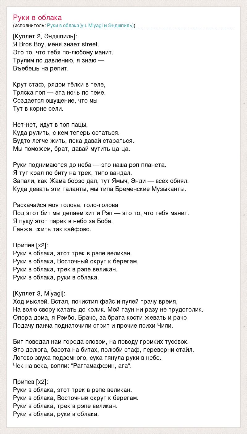 [Куплет 2, Эндшпиль]: Я Bros Boy, меня знает street. Это то, что тебя по-любому манит. Трулим по давлению, я знаю — Въебешь на репит. Крут стаф, рядом тёлки в теле, Тряска поп — эта ночь по теме. Создается ощущение, что мы Тут в корне сели. Нет-нет, идут в топ пацы, Куда рулить, с кем теперь остаться. Будто легче жить, пока давай стараться. Мы поможем, брат, давай мутить ца-ца. Руки поднимаются до неба — это наша рэп планета. Я тут крал по биту на трек, типо вандал. Запали, как Жама борзо дал, тут Ямыч, Энди — всех обнял. Куда девать эти таланты, мы типа Бременские Музыканты. Раскачайся моя голова, голо-голова Под этот бит мы делаем хит и Рэп — это то, что тебя манит. Я пущу этот парик в небо за Боба. Ганжа, жить так кайфово. Припев [x2]: Руки в облака, этот трек в рэпе великан. Руки в облака, Восточный округ к берегам. Руки в облака, трек в рэпе великан. Руки в облака, руки в облака. [Куплет 3, Miyagi]: Ход мыслей. Встал, почистил фэйс и пулей трачу время, На волю свору катать до колик. Мой таун ни разу не трудоголик. Опора дома, я Рэмбо. Брачо, за брата кости жевать и рачо Подачу панча поднаточили стрит и прочие психи Чили. Бит поведал нам города словом, на поводу громких тусовок. Это делюга, басота на битах, полюби стаф, переверни стайл. Логово звука подземного, сука тянула руки в небо. Чек на века, вопли: "Раггамаффин, ага". Припев [x2]: Руки в облака, этот трек в рэпе великан. Руки в облака, Восточный округ к берегам. Руки в облака, трек в рэпе великан. Руки в облака, руки в облака.