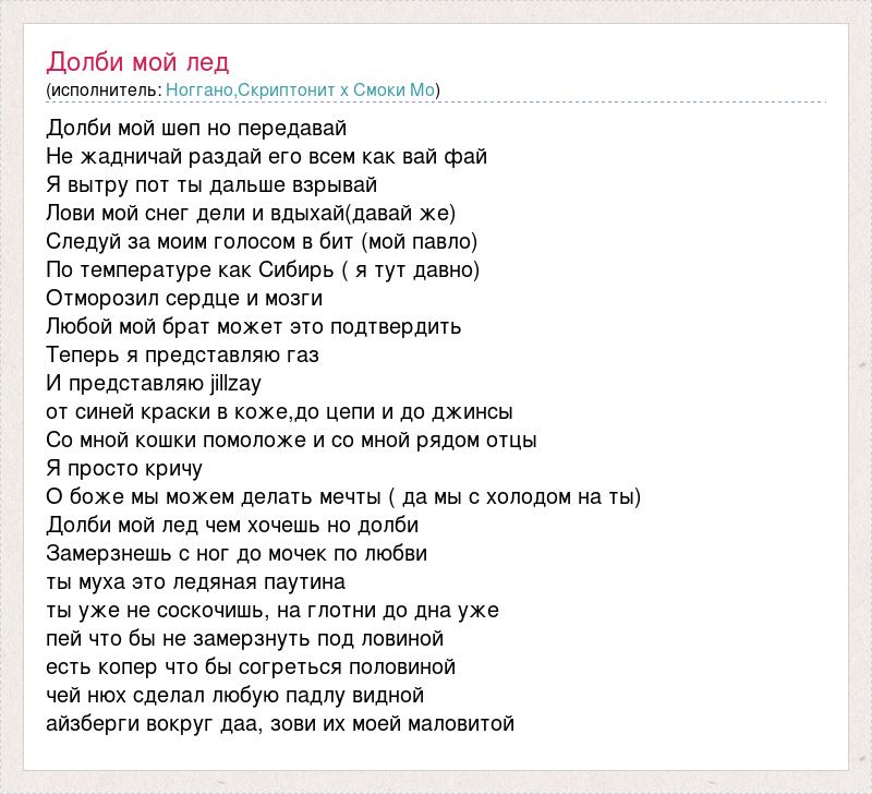 Долби мой шөп но передавай Не жадничай раздай его всем как вай фай Я вытру пот ты дальше взрывай Лови мой снег дели и вдыхай(давай же) Следуй за моим голосом в бит (мой павло) По температуре как Сибирь ( я тут давно) Отморозил сердце и мозги Любой мой брат может это подтвердить Теперь я представляю газ И представляю jillzay от синей краски в коже,до цепи и до джинсы Со мной кошки помоложе и со мной рядом отцы Я просто кричу О боже мы можем делать мечты ( да мы с холодом на ты) Долби мой лед чем хочешь но долби Замерзнешь с ног до мочек по любви ты муха это ледяная паутина ты уже не соскочишь, на глотни до дна уже пей что бы не замерзнуть под ловиной есть копер что бы согреться половиной чей нюх сделал любую падлу видной айзберги вокруг даа, зови их моей маловитой
