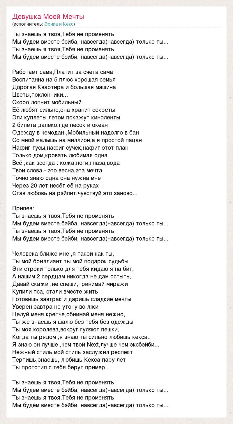 Ты знаешь я твоя,Тебя не променять Мы будем вместе бэйба, навсегда(навсегда) только ты... Ты знаешь я твоя,Тебя не променять Мы будем вместе бэйби, навсегда(навсегда) только ты... Работает сама,Платит за счета сама Воспитанна на 5 плюс хорошая семья Дорогая Квартира и большая машина Цветы,поклонники... Скоро лопнит мобильный. Её любят сильно,она хранит секреты Эти куплеты летом покажут киноленты 2 билета далеко,где песок и океан Одежду в чемодан ,Мобильный надолго в бан Со мной малышь на миллион,а я простой пацан Нафиг тусы,нафиг сучек,нафиг этот план Только дом,кровать,любимая одна Всё ,как всегда : кожа,ноги,глаза,вода Твои слова - это весна,эта мечта Точно знаю одна она нужна мне Через 20 лет несёт её на руках Став любовь на рэйпит,чувствуй это заново... Припев: Ты знаешь я твоя,Тебя не променять Мы будем вместе бэйба, навсегда(навсегда) только ты... Ты знаешь я твоя,Тебя не променять Мы будем вместе бэйби, навсегда(навсегда) только ты... Человека ближе мне ,я такой как ты, Ты мой бриллиант,ты мой подарок судьбы Эти строки только для тебя кидаю я на бит, А нашим 2 сердцам никогда не дам остыть, Давай скажи ,не спеши,принимай миражи Купили пса, стали вместе жить Готовишь завтрак и даришь сладкие мечты Уверен завтра не утону во лжи Целуй меня крепче,обнимай меня нежно, Ты же знаешь я шалю без тебя без одежды Ты моя королева,вокруг гуляют пешки, Когда ты рядом ,я знаю ты сильно любишь кекса.. Я знаю он лучше ,чем твой Next,лучше чем эксбэйби... Нежный стиль,мой стиль заслужил респект Терпишь,знаешь, любишь Кекса пару лет Ты прототип с тебя берут пример.. Ты знаешь я твоя,Тебя не променять Мы будем вместе бэйба, навсегда(навсегда) только ты... Ты знаешь я твоя,Тебя не променять Мы будем вместе бэйби, навсегда(навсегда) только ты...