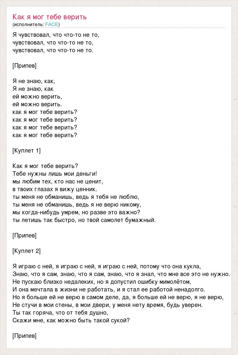 Я чувствовал, что что-то не то, чувствовал, что что-то не то, чувствовал, что что-то не то. [Припев] Я не знаю, как, Я не знаю, как ей можно верить, ей можно верить. как я мог тебе верить? как я мог тебе верить? как я мог тебе верить? как я мог тебе верить? [Куплет 1] Как я мог тебе верить? Тебе нужны лишь мои деньги! мы любим тех, кто нас не ценит, в твоих глазах я вижу ценник. ты меня не обманишь, ведь я тебя не люблю, ты меня не обманишь, ведь я не верю никому, мы когда-нибудь умрем, но разве это важно? ты летишь так быстро, но твой самолет бумажный. [Припев] [Куплет 2] Я играю с ней, я играю с ней, я играю с ней, потому что она кукла, Знаю, что я сам, знаю, что я сам, знаю, что я знал, что мне все это не нужно. Не пускаю близко недалеких, но я допустил ошибку мимолётом, И она мечтала в жизни не работать, и я стал ее работой ненадолго. Но я больше ей не верю в самом деле, да, я больше ей не верю, я не верю, Не стучи в мои стены, в мои двери, у меня нету время, будь уверен. Ты так горяча, что от тебя душно, Скажи мне, как можно быть такой сукой? [Припев]