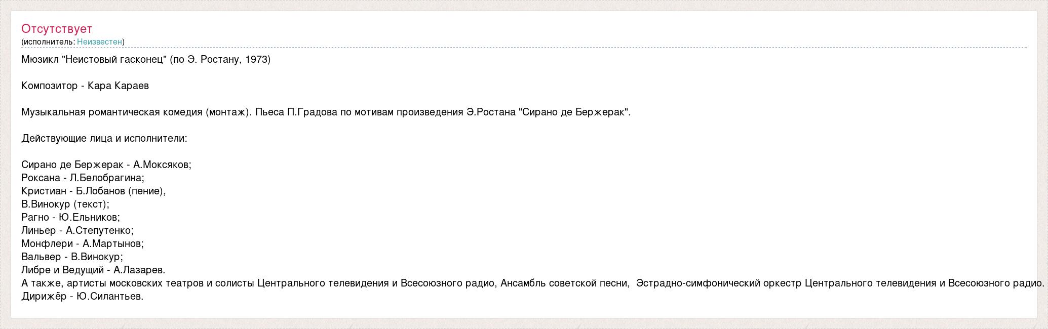 Мюзикл "Неистовый гасконец" (по Э. Ростану, 1973) Композитор - Кара Караев Музыкальная романтическая комедия (монтаж). Пьеса П.Градова по мотивам произведения Э.Ростана "Сирано де Бержерак". Действующие лица и исполнители: Сирано де Бержерак - А.Моксяков; Роксана - Л.Белобрагина; Кристиан - Б.Лобанов (пение), В.Винокур (текст); Рагно - Ю.Ельников; Линьер - А.Степутенко; Монфлери - А.Мартынов; Вальвер - В.Винокур; Либре и Ведущий - А.Лазарев. А также, артисты московских театров и солисты Центрального телевидения и Всесоюзного радио, Ансамбль советской песни, Эстрадно-симфонический оркестр Центрального телевидения и Всесоюзного радио. Дирижёр - Ю.Силантьев.