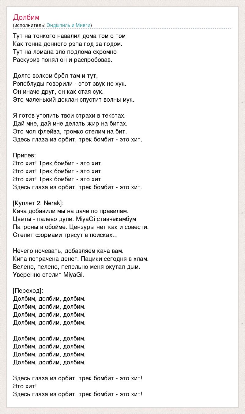 Тут на тонкого навалил дома том о том Как тонна донного рэпа год за годом. Тут на ломана зло подлома скромно Раскурив понял он и распробовав. Долго волком брёл там и тут, Рэпоблуды говорили - этот звук не хук. Он иначе друг, он как стая сук. Это маленький доклан спустит волны мук. Я готов утопить твои страхи в текстах. Дай мне, дай мне делать жир на битах. Это моя флейва, громко стелим на бит. Здесь глаза из орбит, трек бомбит - это хит. Припев: Это хит! Трек бомбит - это хит. Это хит! Трек бомбит - это хит. Это хит! Трек бомбит - это хит. Здесь глаза из орбит, трек бомбит - это хит. [Куплет 2, Nerak]: Кача добавили мы на даче по правилам. Цветы - палево дули. MiyaGi ставчекамбум Патроны в обойме. Цензуры нет как и совести. Стелит формами трясут в поисках... Нечего ночевать, добавляем кача вам. Кипа потрачена денег. Пацики сегодня в хлам. Велено, пелено, пепельно меня окутал дым. Уверенно стелит MiyaGi. [Переход]: Долбим, долбим, долбим. Долбим, долбим, долбим. Долбим, долбим, долбим. Долбим, долбим, долбим. Долбим, долбим, долбим. Долбим, долбим, долбим. Долбим, долбим, долбим. Долбим, долбим, долбим. Здесь глаза из орбит, трек бомбит - это хит! Это хит! Здесь глаза из орбит, трек бомбит - это хит!