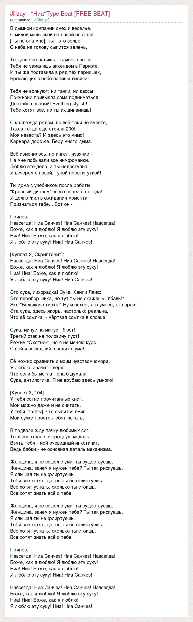 В дымной компании смех и веселье. С милой малышкой на новой постели. [Ты не она мне], ты - это зелье. С неба на голову сыпится зелень. Ты даже не палишь, ты много выше. Тебя не заманишь викендом в Париже. И ты же поставила в ряд тех парнишек, Бросающих в небо папины тысячи! Тебя не волнуют: ни тачки, ни кассы; По-жизни привыкла сама подниматься! Достойна оваций! Evething stylish! Тебе хотят все, но ты их динамишь! С коллежда рядом, но всё-таки не вместе, Такса тогда еще стоила 200! Моя невеста? И здесь это мимо! Карьера дороже. Беру много дыма. Всё изменилось, не ангел, извянки - На мне побывали все нимфоманки. Люблю это дело, а ты недоступна. Я вечером с новой, тупой проституткой! Ты дома с учебником после работы. "Красный диплом" всего через пол-года! Я долго жил в ожидании момента, Признаться тебе... Вот он - Припев: Навсегда! Ниа Санчез! Ниа Санчез! Навсегда! Боже, как я люблю! Я люблю эту суку! Ниа! Ниа! Боже, как я люблю! Я люблю эту суку! Ниа! Ниа Санчез! [Куплет 2, Скриптонит]: Навсегда! Ниа Санчез! Ниа Санчез! Навсегда! Боже, как я люблю! Я люблю эту суку! Ниа! Ниа! Боже, как я люблю! Я люблю эту суку! Ниа! Ниа Санчез! Это сука, лихорадка! Сука, Кайли Лайф! Это перебор шика, но тут ты не скажешь "Убавь!" Это "Большая стирка!" Ну и похер, кто умнее, кто прав! Эта сука, здесь якорь, настолько реальна, Что её ссылка, - мёртвая ссылка в клоаке! Сука, минус на минус - бюст! Третий стэк на половину пуст! Режим "Охотник", но я не меняю курс. С ней я сошедший, сводит с ума! Её можно сравнить с моим чувством юмора. Я люблю, значит - верю, Что если бы могла - она б думала. Сука, антилогика. Я не врубаю здесь умного! [Куплет 3, 104]: У тебя сотни прочитанных книг. Мои можно даже и не считать. У тебя [толпы], что сыпится вмиг. Мои сучки просто любят летать. В подвале жду пачку любимых сиг. Ты в спортзале очередную медаль.. Взять тебя - мой очевидный инкстинкт. Ведь бабки - не основная деталь механизма. Женщина, я не сошел с ума, ты существуешь. Женщина, зачем я нужен тебе? Ты так рискуешь. Я слышал ты не флиртуешь. Тебя все хотят, да, но ты не флиртуешь. Все хотят узнать, сколько ты стоишь. Все хотят знать всё о тебе. Женщина, я не сошел с ума, ты существуешь. Женщина, зачем я нужен тебе? Ты так рискуешь. Я слышал ты не флиртуешь. Тебя все хотят, да, но ты не флиртуешь. Все хотят узнать, сколько ты стоишь. Все хотят знать всё о тебе. Припев: Навсегда! Ниа Санчез! Ниа Санчез! Навсегда! Боже, как я люблю! Я люблю эту суку! Ниа! Ниа! Боже, как я люблю! Я люблю эту суку! Ниа! Ниа Санчез! Навсегда! Ниа Санчез! Ниа Санчез! Навсегда! Боже, как я люблю! Я люблю эту суку! Ниа! Ниа! Боже, как я люблю! Я люблю эту суку! Ниа! Ниа Санчез!