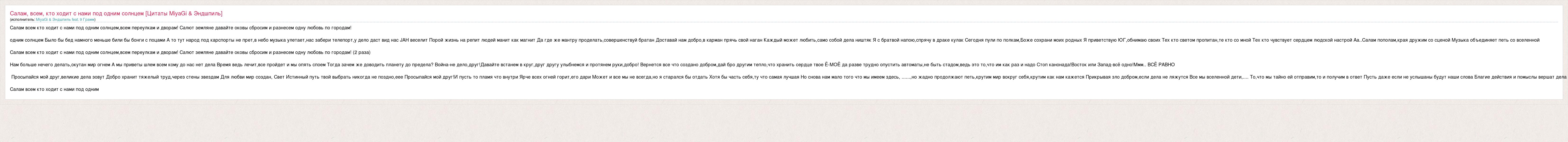 Салам всем кто ходит с нами под одним солнцем,всем переулкам и дворам! Салют земляне давайте оковы сбросим и разнесем одну любовь по городам! одним солнцем Было бы бед намного меньше били бы бонги с поцами А то тут народ под карспорты не прет,в небо музыка улетает,нас забери телепорт,у дело даст вид нас JAH веселит Порой жизнь на репит людей манит как магнит Да где же мантру проделать,совершенствуй братан Доставай нам добро,в карман прячь свой наган Каждый может любить,само собой дела ништяк Я с братвой напою,спрячу в драке кулак Сегодня пули по полкам,Боже сохрани моих родных Я приветствую ЮГ,обнимаю своих Тех кто светом пропитан,те кто со мной Тех кто чувствует сердцем людской настрой Аа..Салам пополам,края дружим со сценой Музыка объединяет петь со вселенной Салам всем кто ходит с нами под одним солнцем,всем переулкам и дворам! Салют земляне давайте оковы сбросим и разнесем одну любовь по городам! (2 раза) Нам больше нечего делать,окутан мир огнем А мы приветы шлем всем кому до нас нет дела Время ведь лечит,все пройдет и мы опять споем Тогда зачем же доводить планету до предела? Война-не дело,друг!Давайте встанем в круг,друг другу улыбнемся и протянем руки,добро! Вернется все что создано добром,дай бро другим тепло,что хранить сердце твое Ё-МОЁ да разве трудно опустить автоматы,не быть стадом,ведь это то,что им как раз и надо Стоп канонада!Восток или Запад-всё одно!Ммм.. ВСЁ РАВНО Просыпайся мой друг,великие дела зовут Добро хранит тяжелый труд,через стены звездам Для любви мир создан, Свет Истинный путь твой выбрать никогда не поздно,еее Просыпайся мой друг!И пусть то пламя что внутри Ярче всех огней горит,его дари Может и все мы не всегда,но я старался бы отдать Хотя бы часть себя,ту что самая лучшая Но снова нам мало того что мы имеем здесь, ......,но жадно продолжают петь,крутим мир вокруг себя,крутим как нам кажется Прикрывая зло добром,если дела не ляжутся Все мы вселенной дети,.... То,что мы тайно ей отправим,то и получим в ответ Пусть даже если не услышаны будут наши слова Благие действия и помыслы вершат дела Салам всем кто ходит с нами под одним